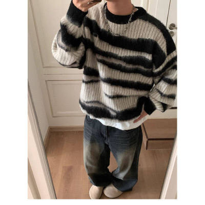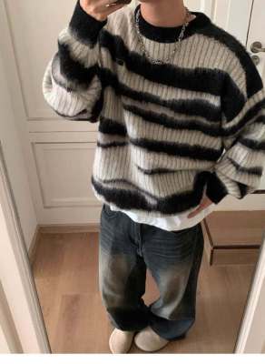 American retro black and white striped sweater men's trendy mohair sweater autumn and winter high street jacket
