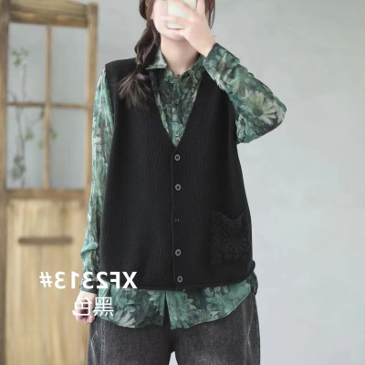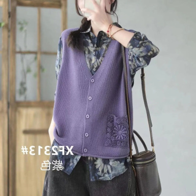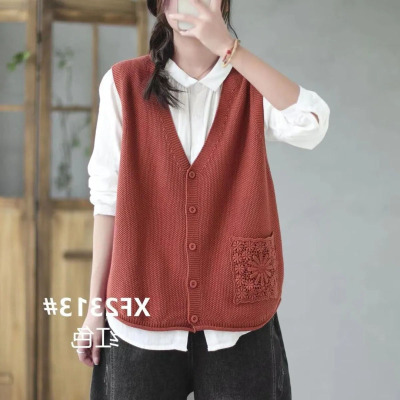 Knitted V-neck cotton-lined cardigan vest for women, new style of literary hollow pockets, loose and versatile sleeveless horse clip