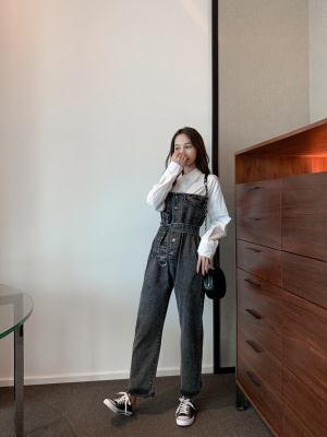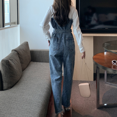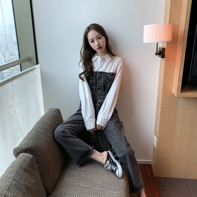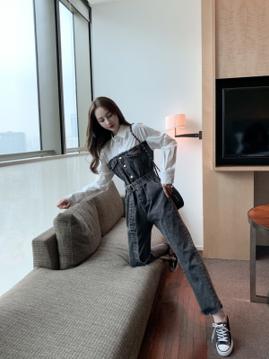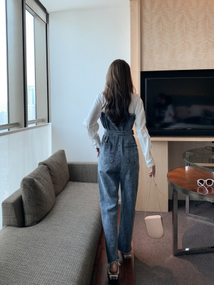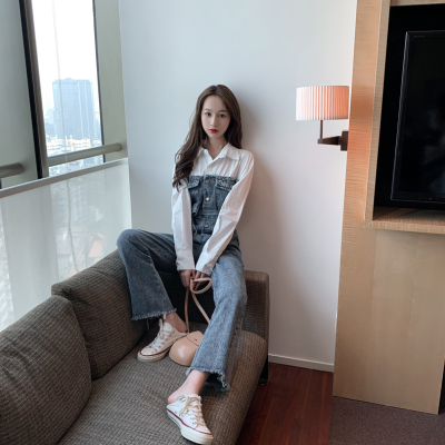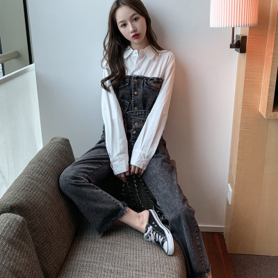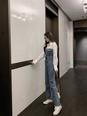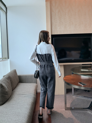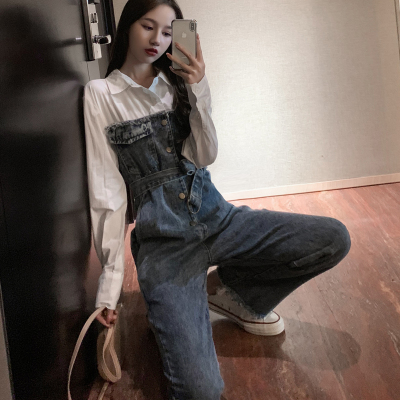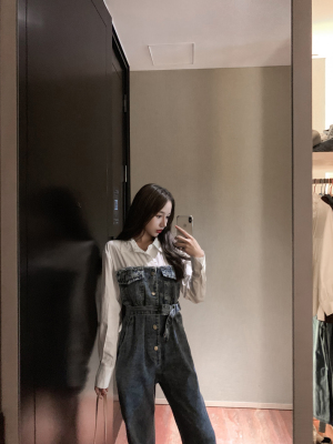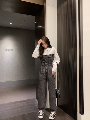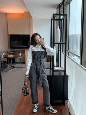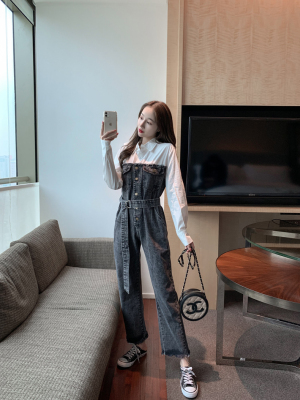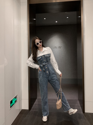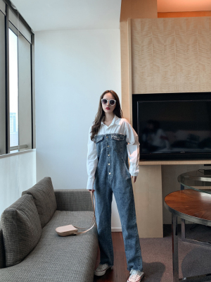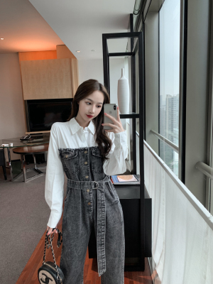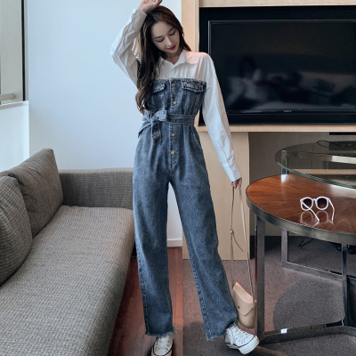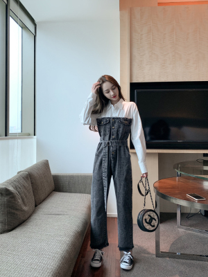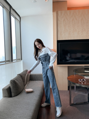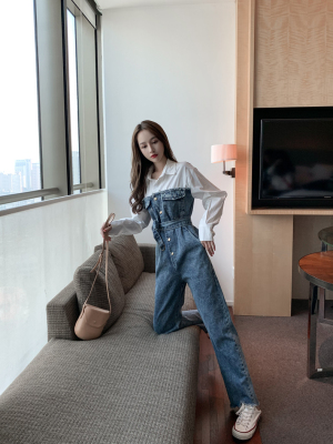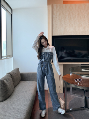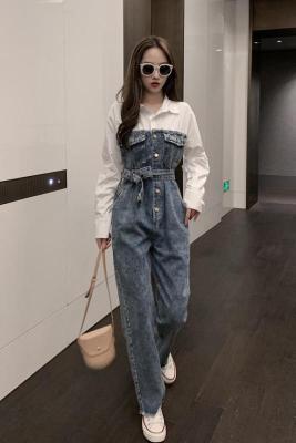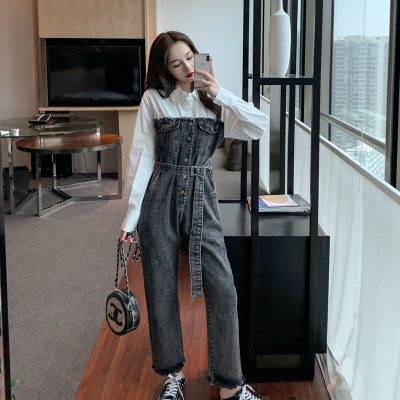Denim spliced jumpsuits for women in spring and summer Korean style Hong Kong style high-waist jumpsuit white shirt age-reducing work pants