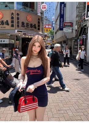 Tongiiuu Blokette 復古印花吊帶連衣裙女顯瘦a字包臀短裙帶胸墊