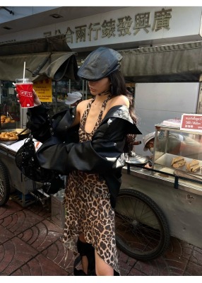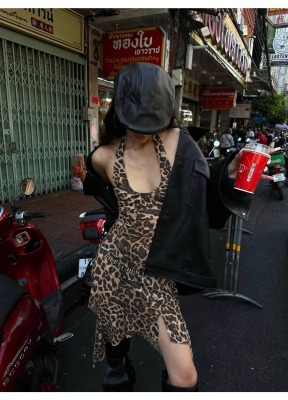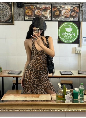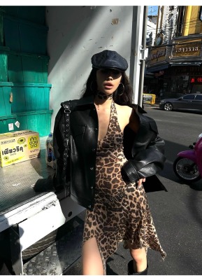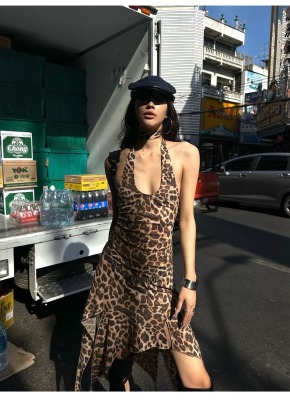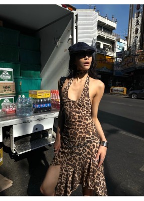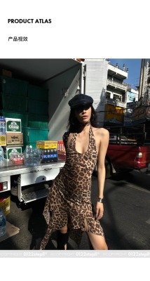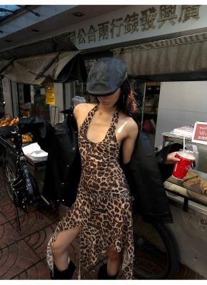 野性因子豹紋不規則裙擺連衣裙掛脖露背設計感吊帶裙