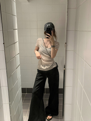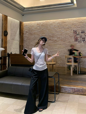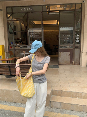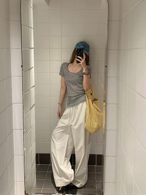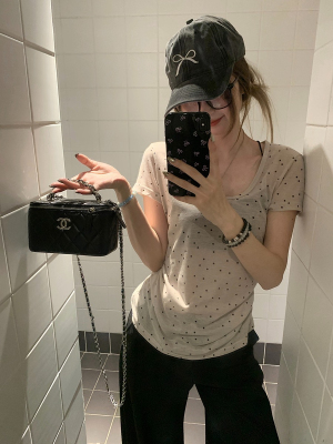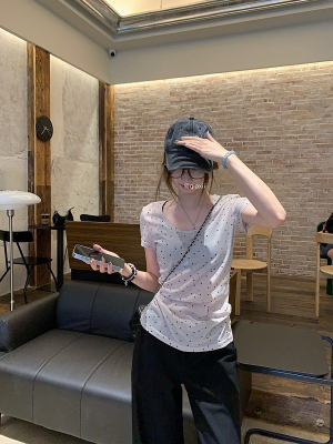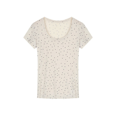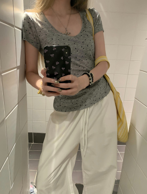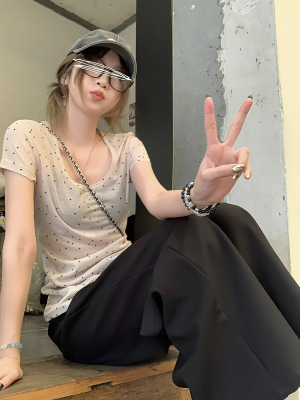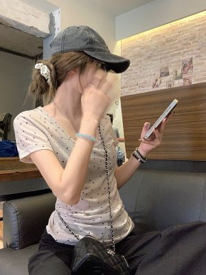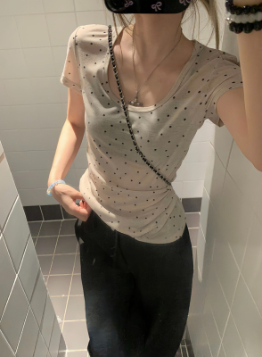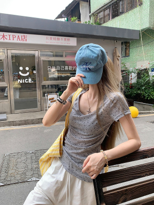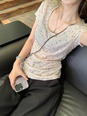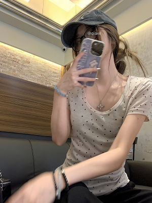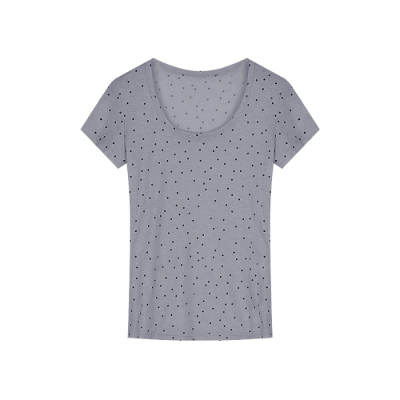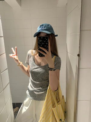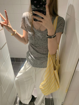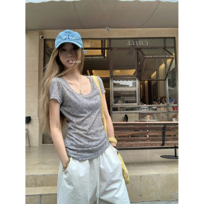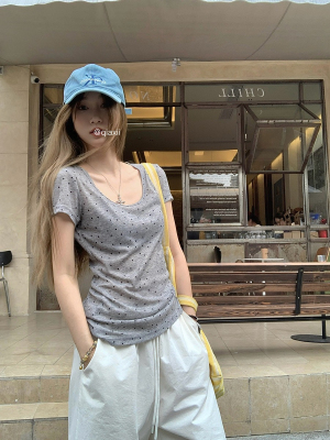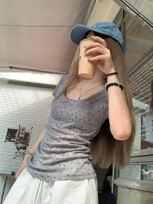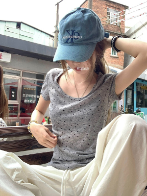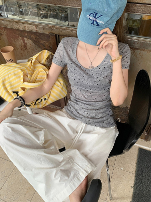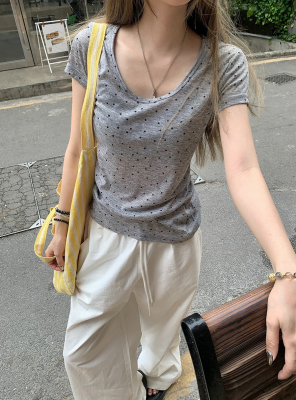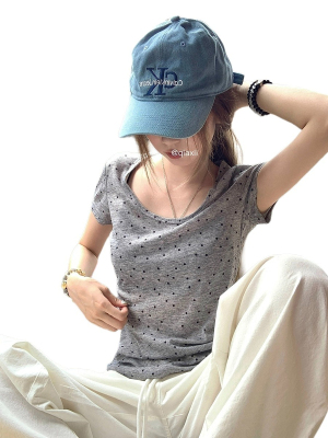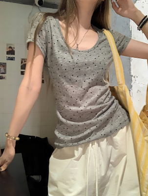 Women's Summer New Arrival Thin U-Neck Polka-Dot T-Shirt in Gray—Vintage Style, Perfectly Designed Short-Sleeve Top