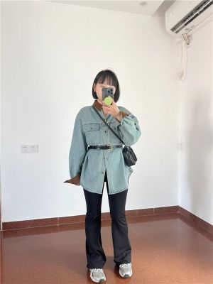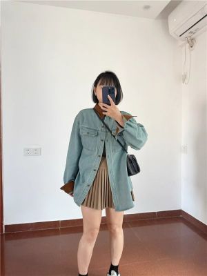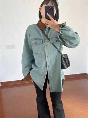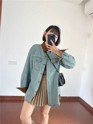 Hong Kong style retro contrasting lapel spliced denim shirt for women in autumn high-end double pocket loose age-reducing top trendy