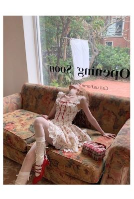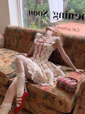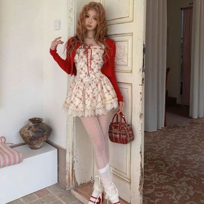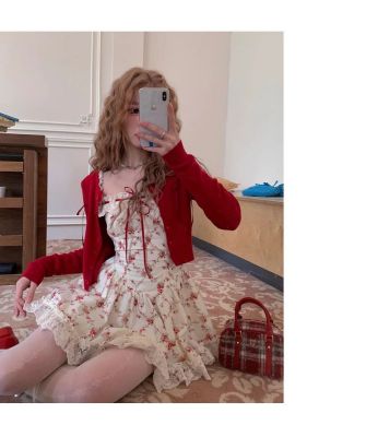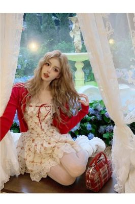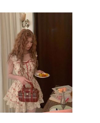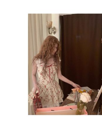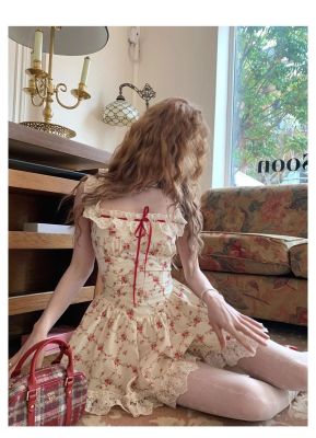 Rich roses, apricot pastoral floral French lace suspender dress, spring and summer