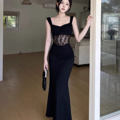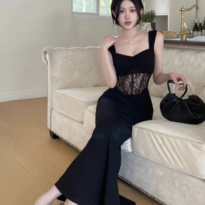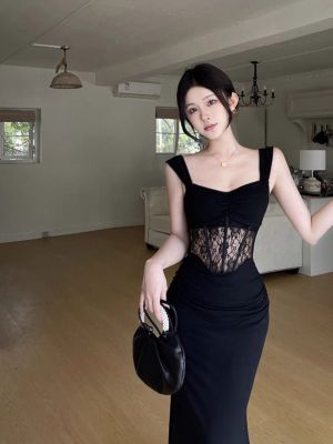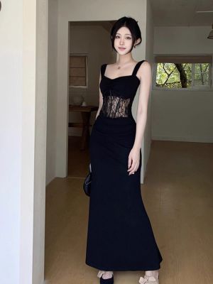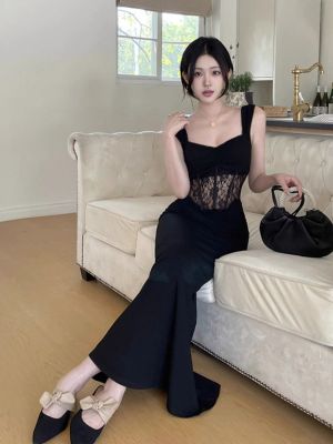 2025 New Summer Black French Lace Sexy Fishbone Patchwork High-End Bodice Skirt Bodycon Dress for Women