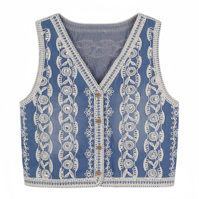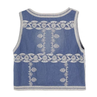 新款復古風輕奢亮片重工鈎花刺繡牛仔背心馬甲薄款坎肩疊穿上衣