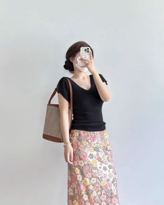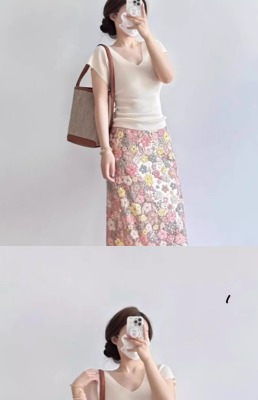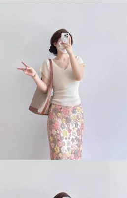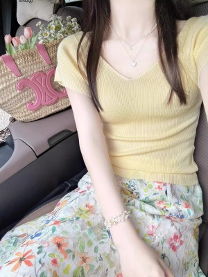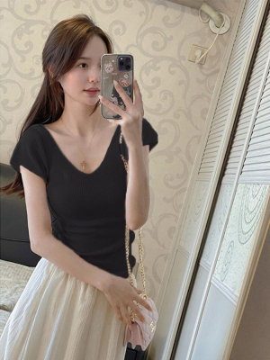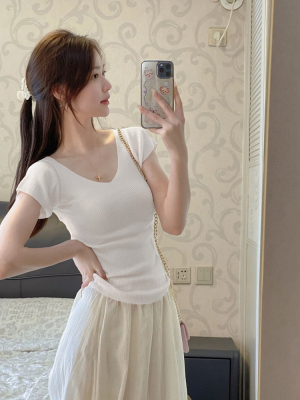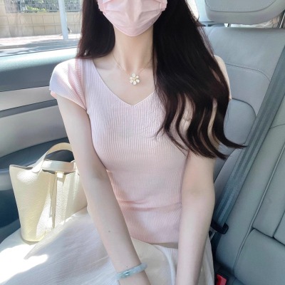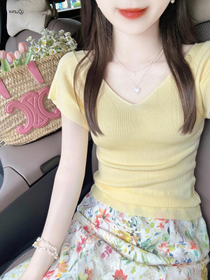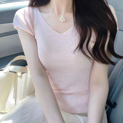 Cream-colored V-neck small-flare-sleeve ice silk short-sleeved women's summer thin elegant slimming straight-shoulder knitted T-shirt top