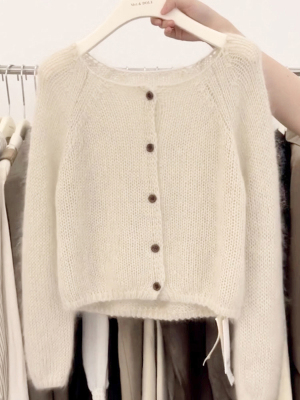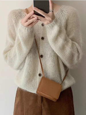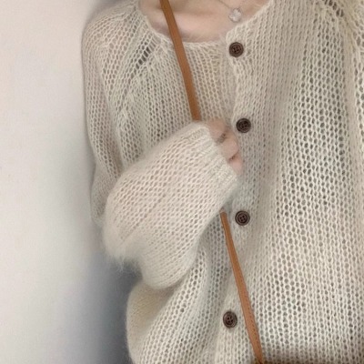 復古慵懶風薄款馬海毛針織開衫女早春季新款鏤空寬鬆毛衣外套