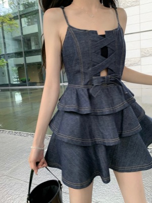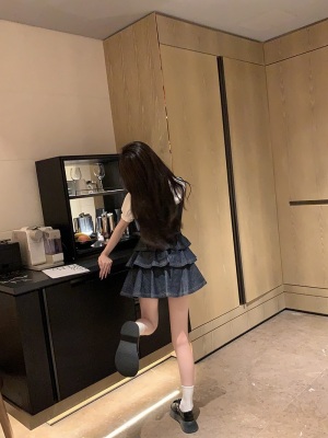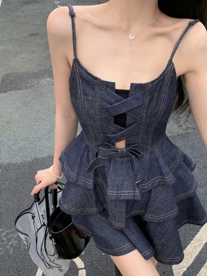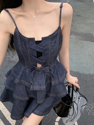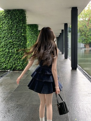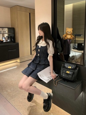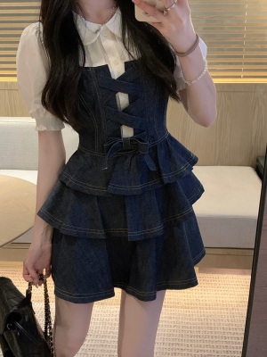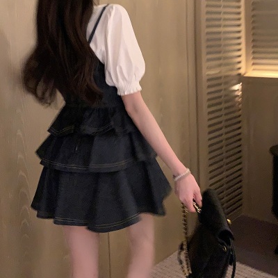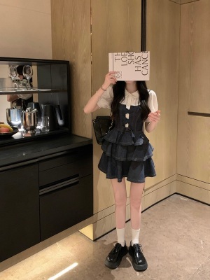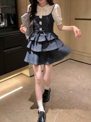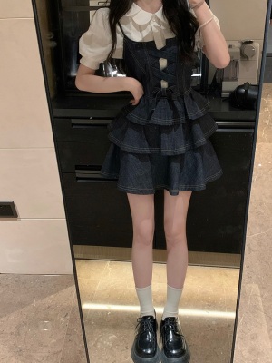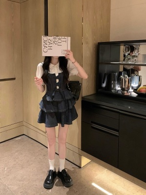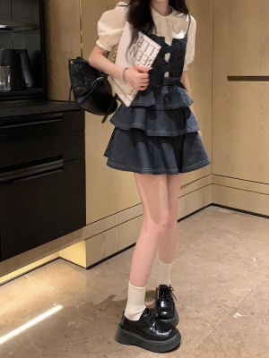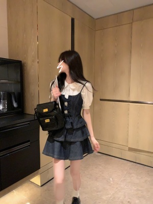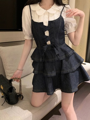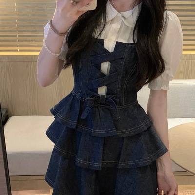法式公主蓬蓬裙小個子甜酷風牛仔吊帶連衣裙子娃娃領襯衫兩件套裝