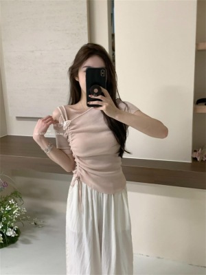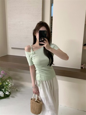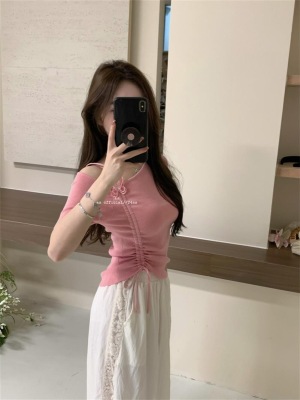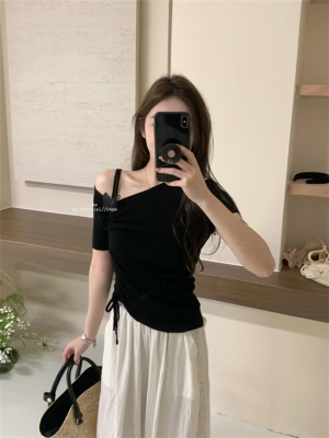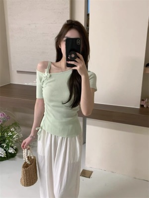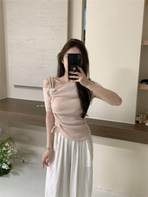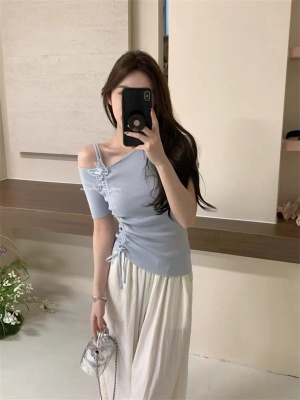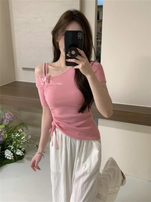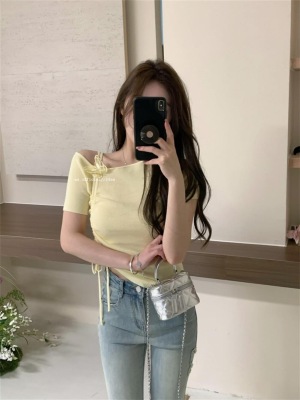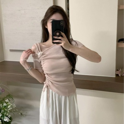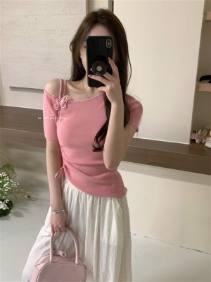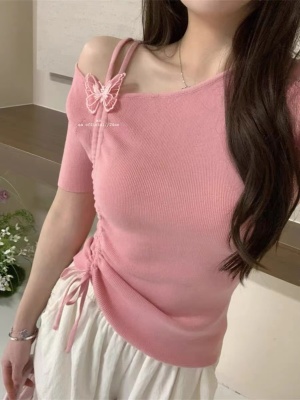 Women's Summer New Design 3D Butterfly Halter Neck Drawstring Short Sleeve Top