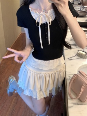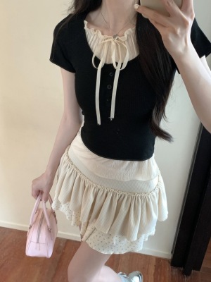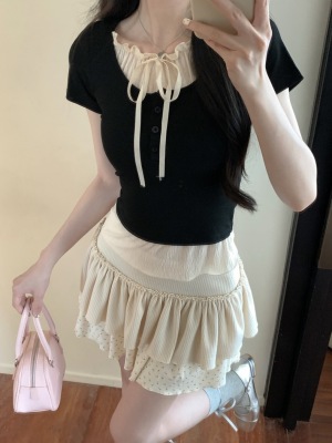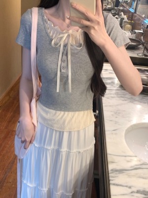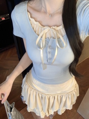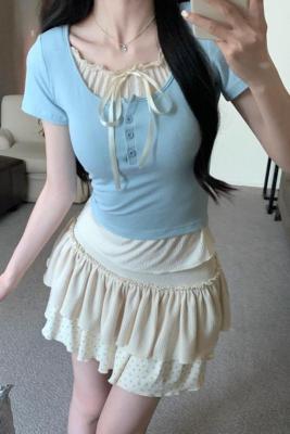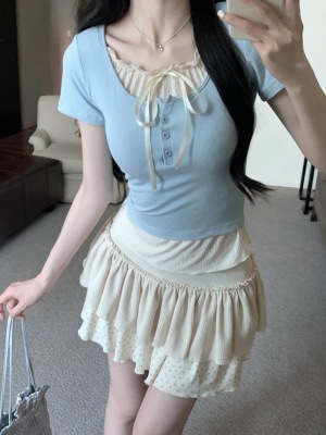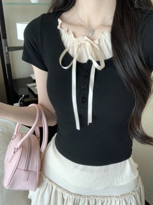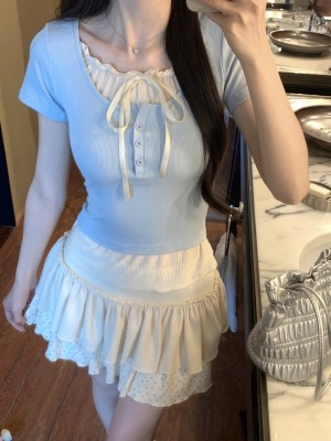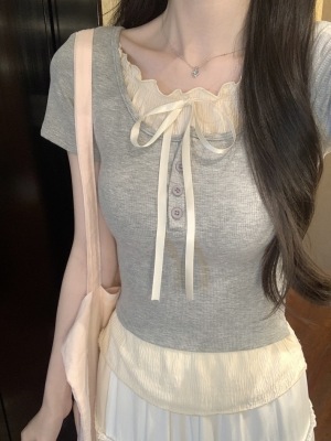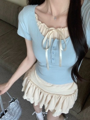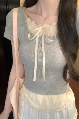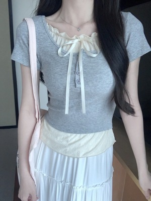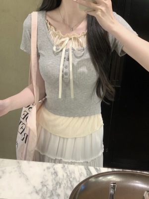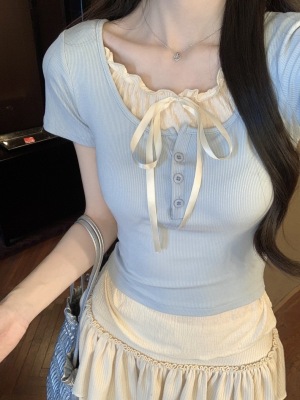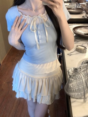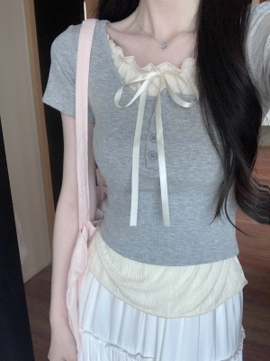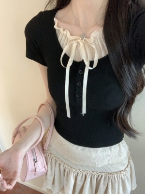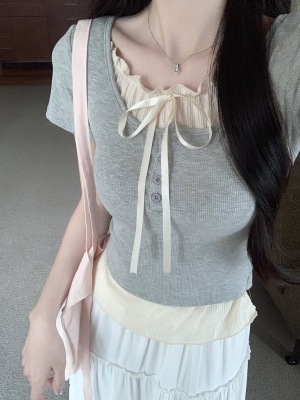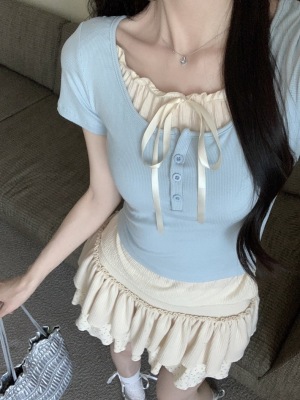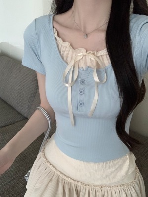 Pure desire light blue bow fake two-piece short-sleeved T-shirt for women's spring and summer style black ears on the shoulder top