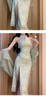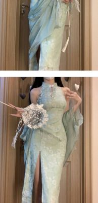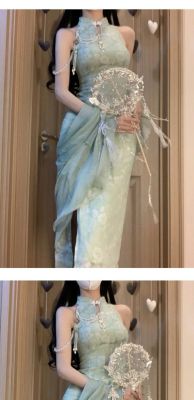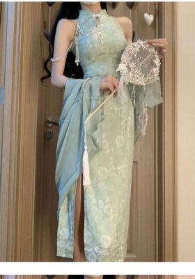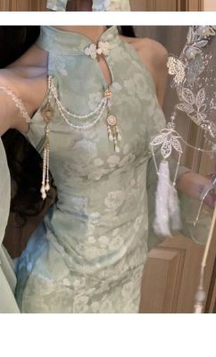 A modern Chinese style, with a refreshing and cool national charm, green improved cheongsam, exuding a sexy and charming vibe, stunningly beautiful, with a halter neck design, for women in summer.