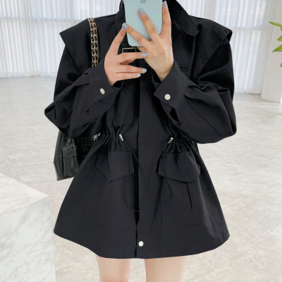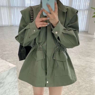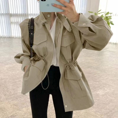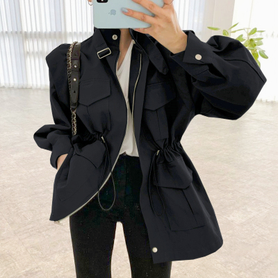 2025 South Korean chic retro stand-up collar multi-pocket drawstring cinched waist slimming medium-length workwear jacket for women
