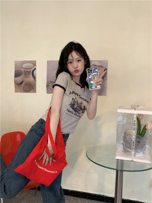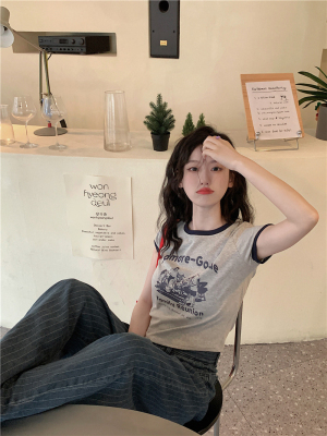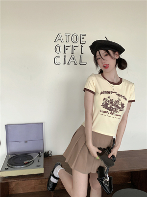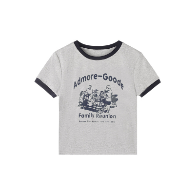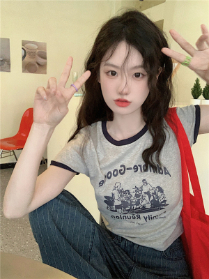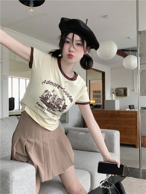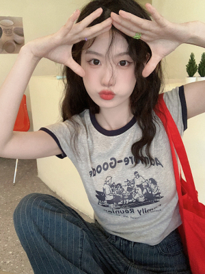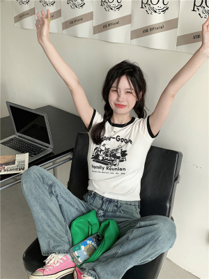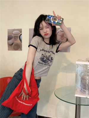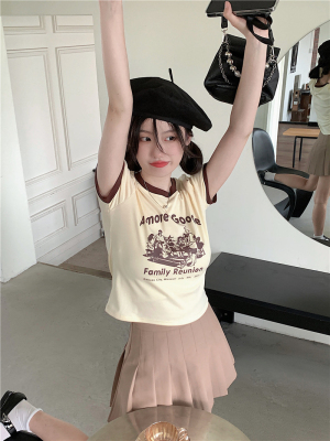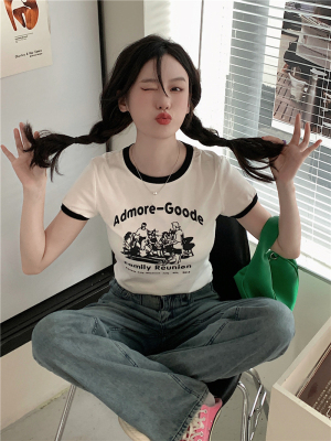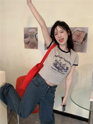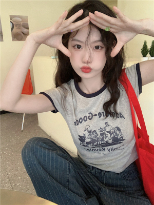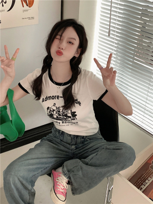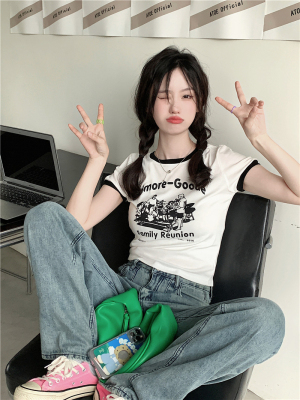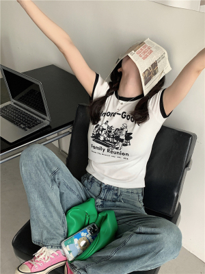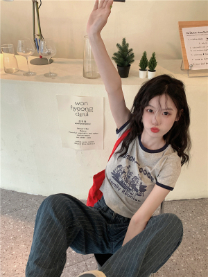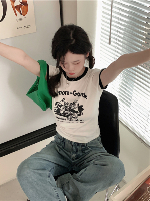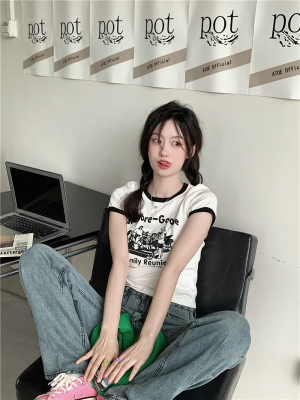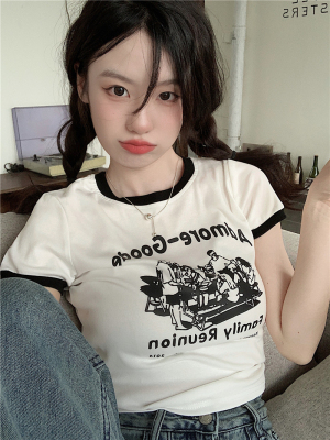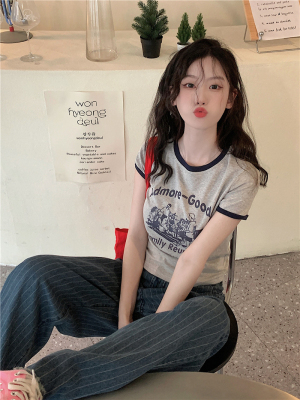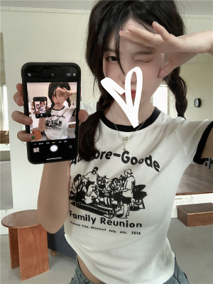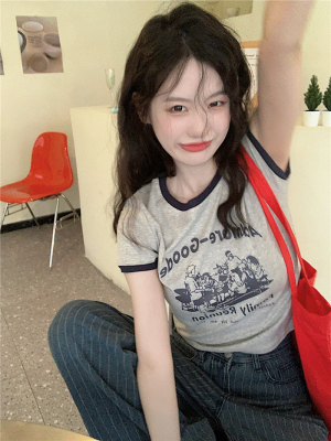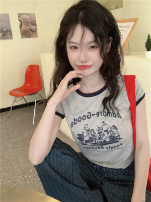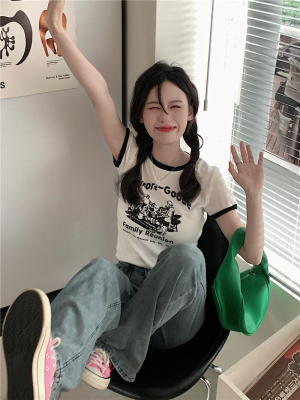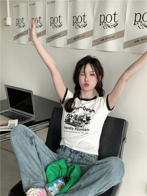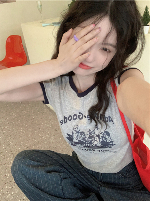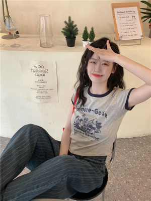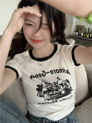 韓國外貿韓版新款印花夏季修身短款撞色圓領短袖T恤