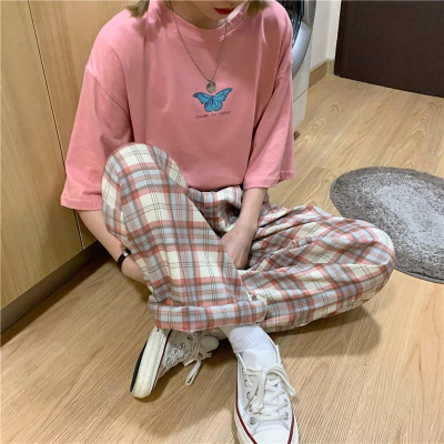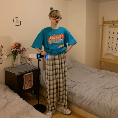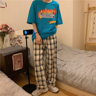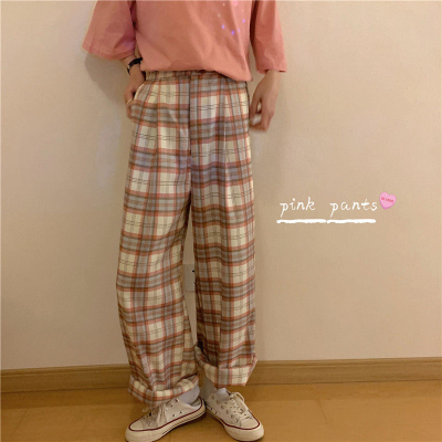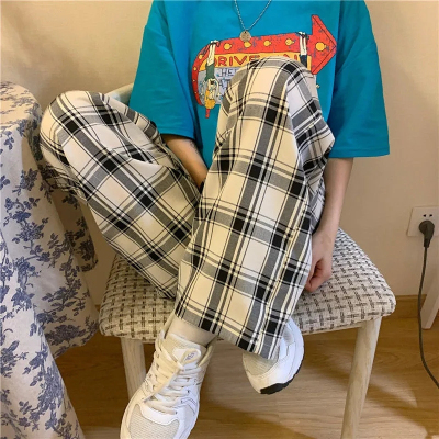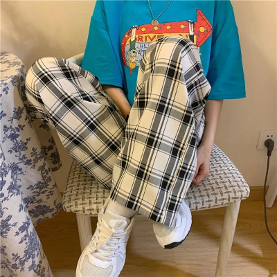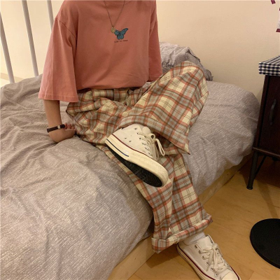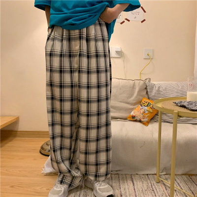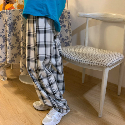 韓國外貿大碼直筒褲寬鬆格子休閒褲女夏季薄款拖地褲百搭闊腿褲