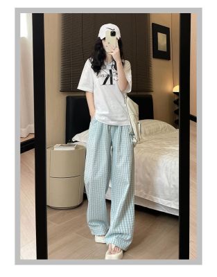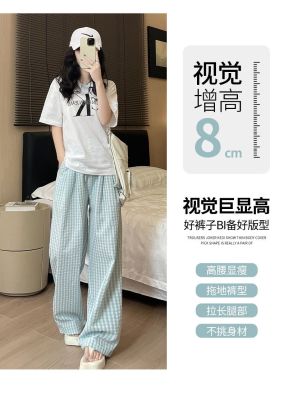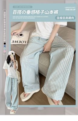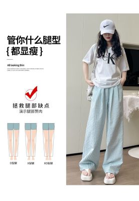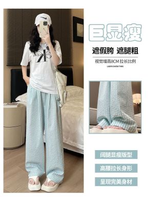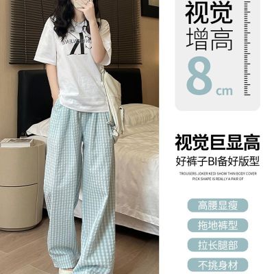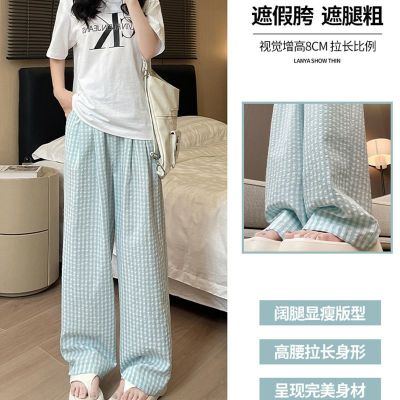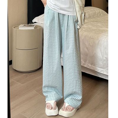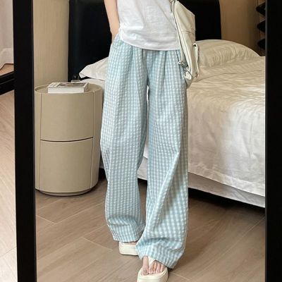 Original Fabric Retro Blue Grid Pants for Women - Summer New Arrival High-Waisted Drape Leisure Strolling Pants