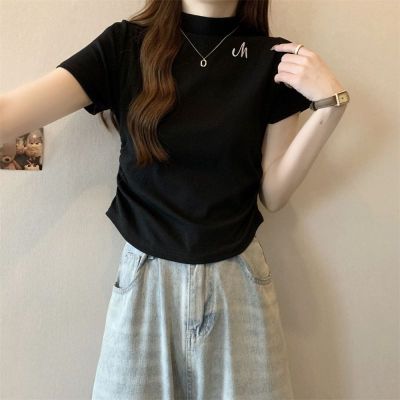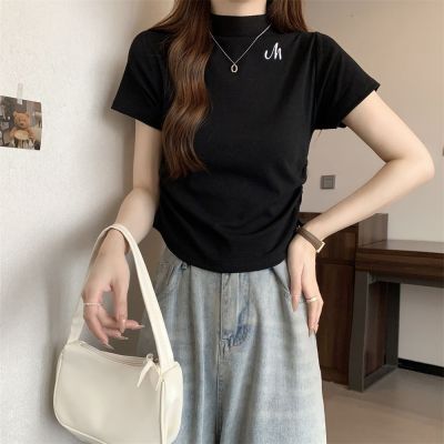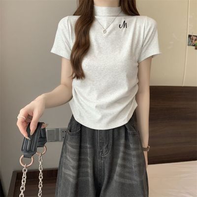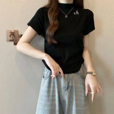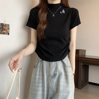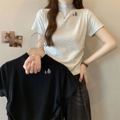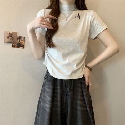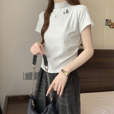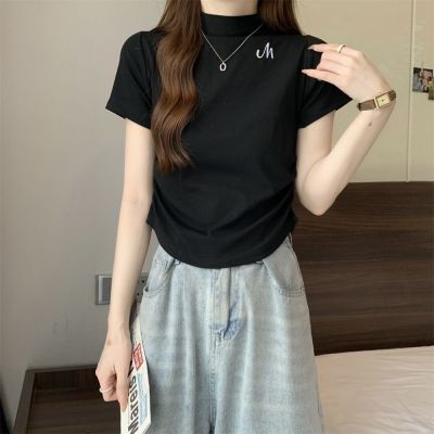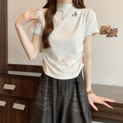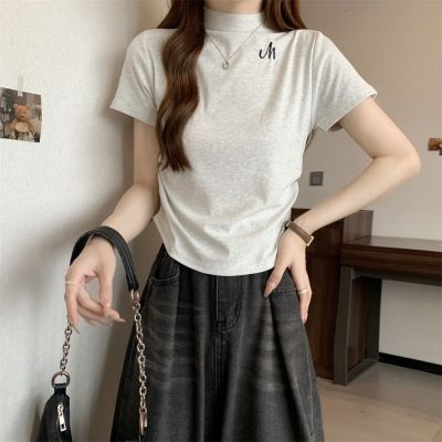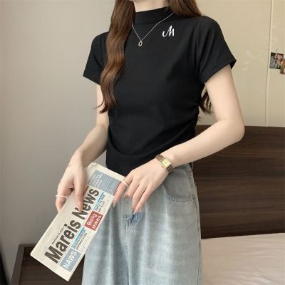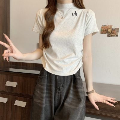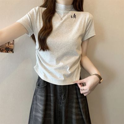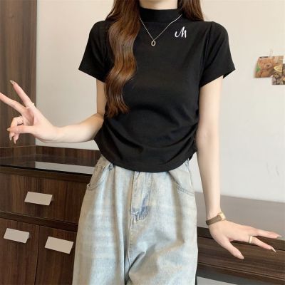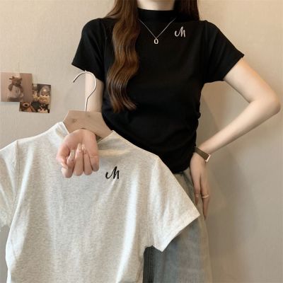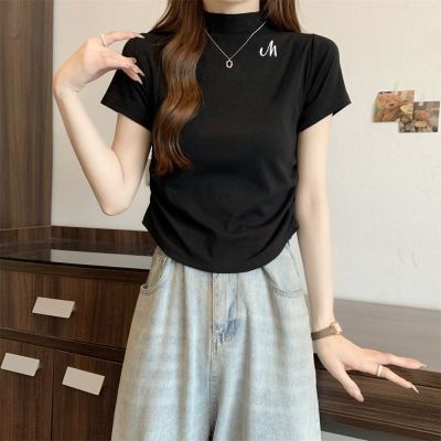 Real shot 40 pure cotton 210g 92 cotton/8 spandex half high neck short sleeve T-shirt for women
