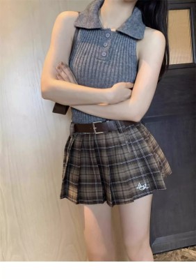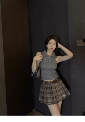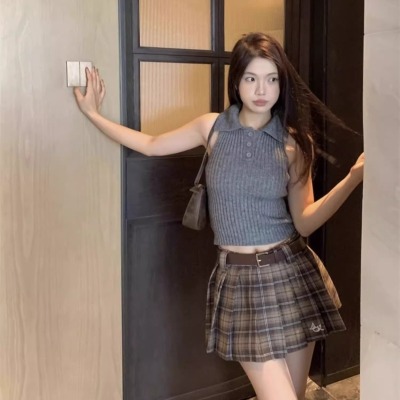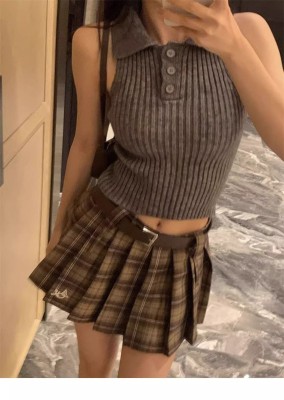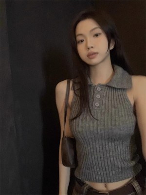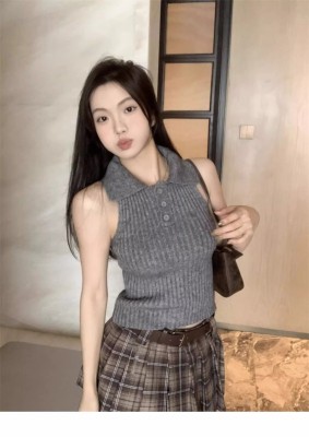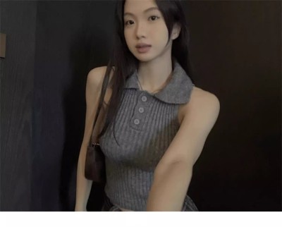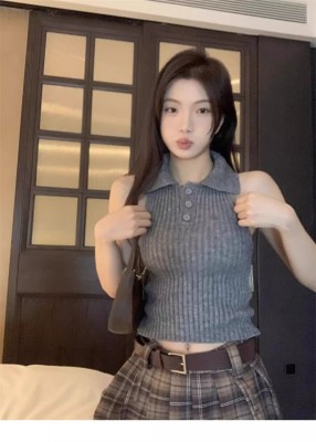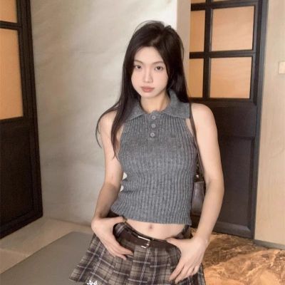 學院風翻領半開胸套頭坑條顯瘦背心女2025年春夏季短款針織潮