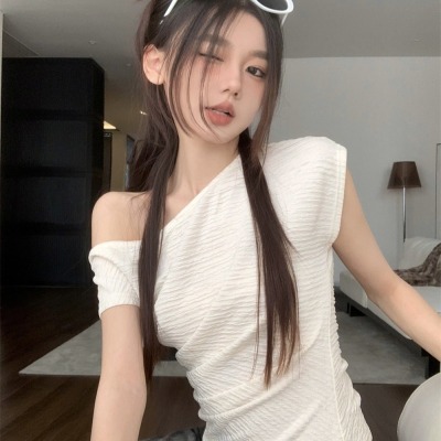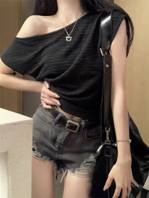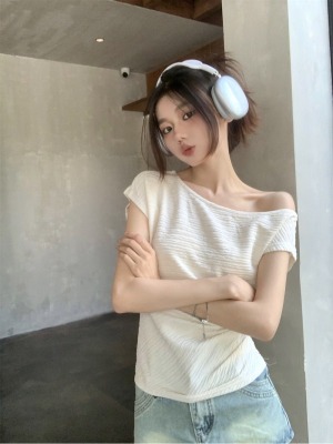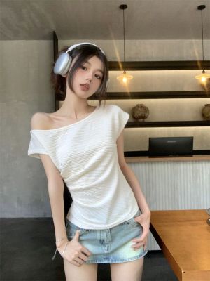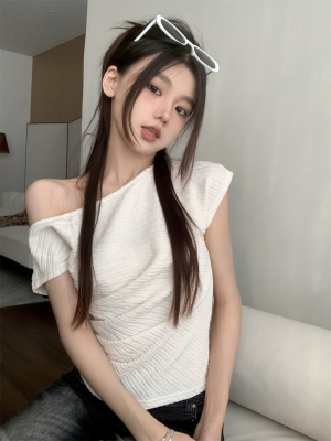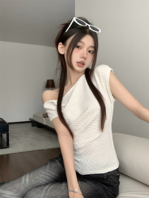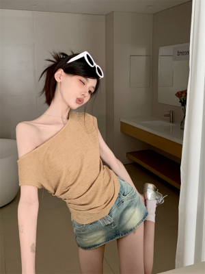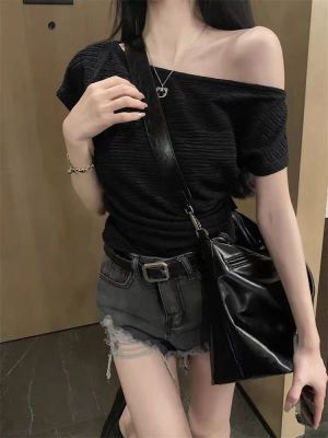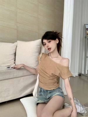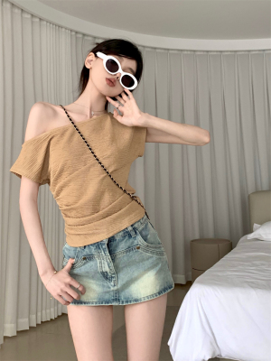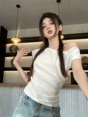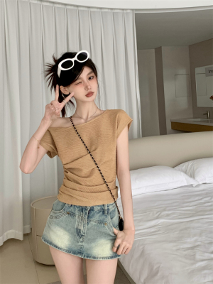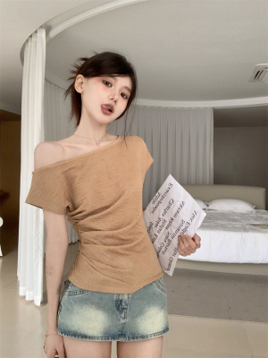 純欲風辣妹斜領露肩短袖t恤女夏季設計感小心機褶皺顯瘦百搭上衣