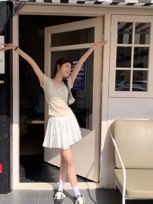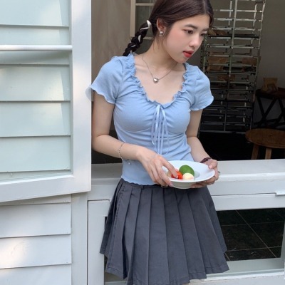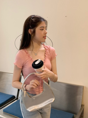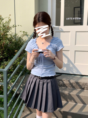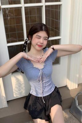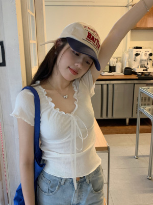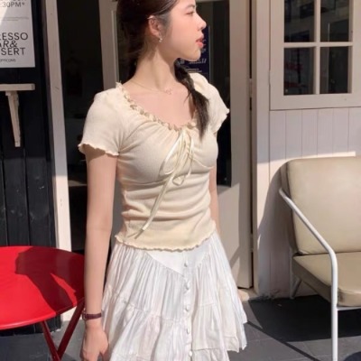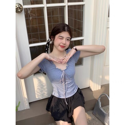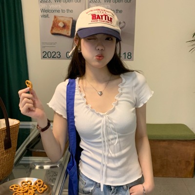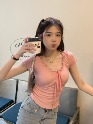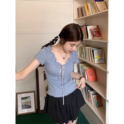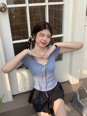 Stylish wood-edge lace-up short-sleeve T-shirt for women—summer, ultra-feminine, slimming, and cropped design