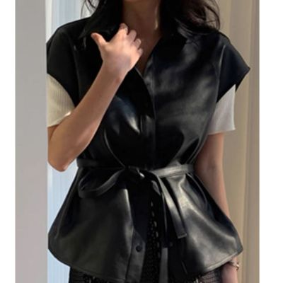 Korean Chic Autumn Retro Niche Lapel Single-Breasted Lace-Up Waist-Slimming Sleeveless Leather Vest Coat for Women