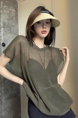 Korean short-sleeved T-shirt for women in summer thin hot girls hollow sunscreen blouse design loose and slim short top