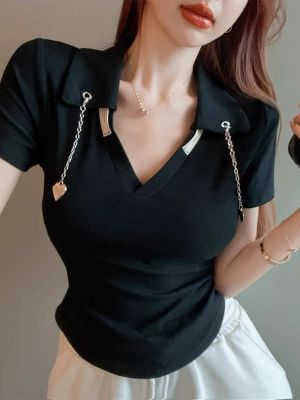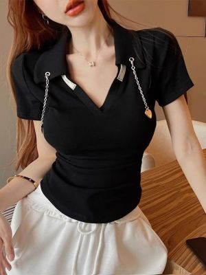 Women's Summer Short-Sleeve Unstructured Shoulder Polo T-Shirt, Edgy, Fitted, Stylish, Ins Trendy Top