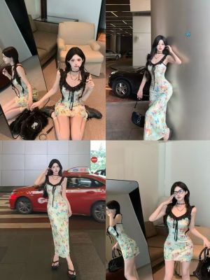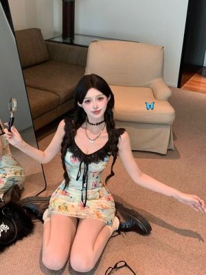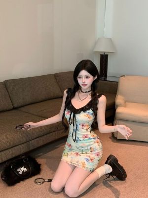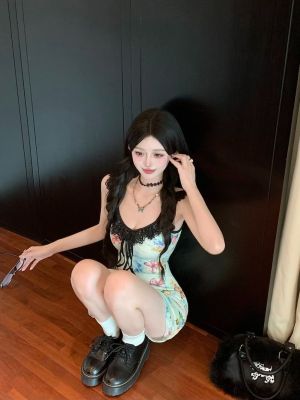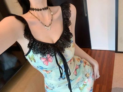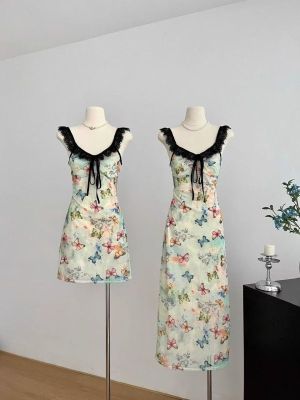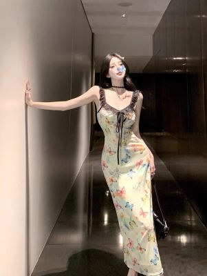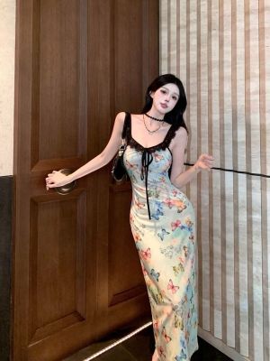 Pure butterfly printed straps suspender dress for women in summer new sweet and spicy waist-hugging vacation casual skirt