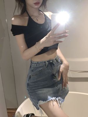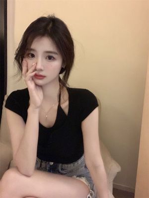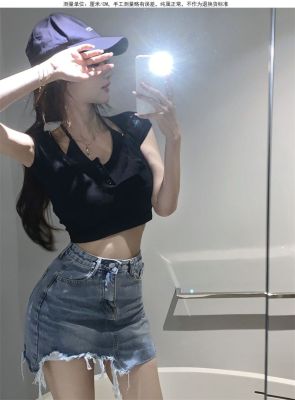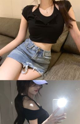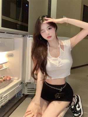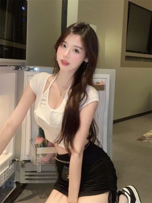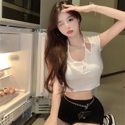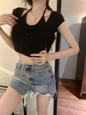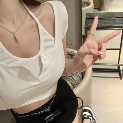Pure and fake two-piece neck top chic design high-end niche high waist short sweet cool short sleeve T-shirt for women