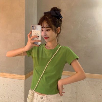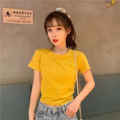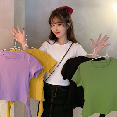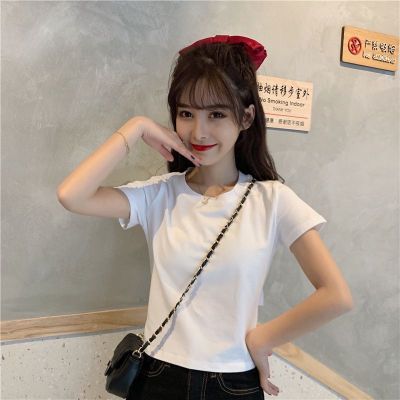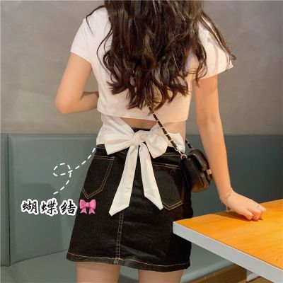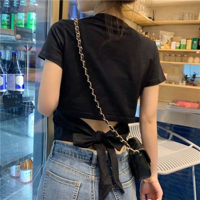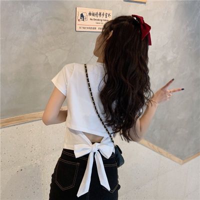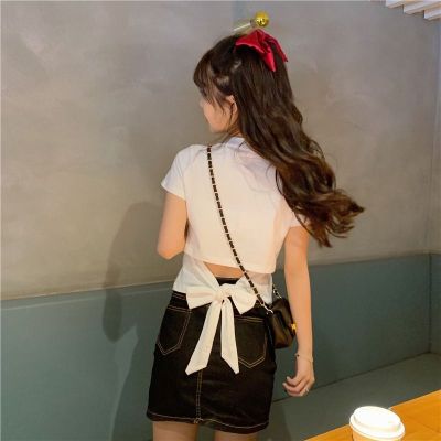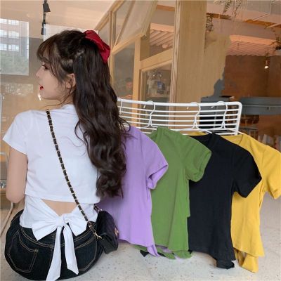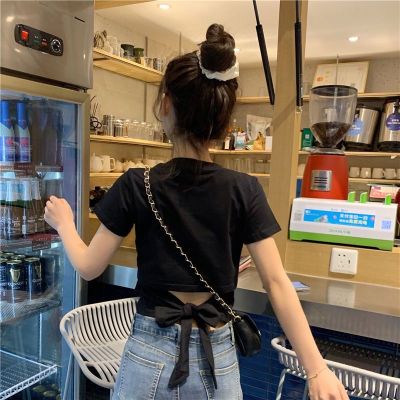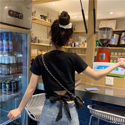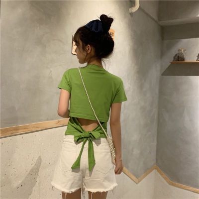 外貿原版新款韓版短袖t恤女夏季辣妹露背蝴蝶結漏背短款