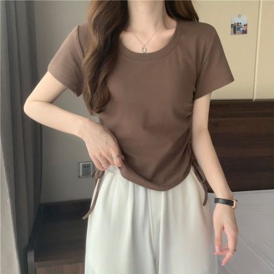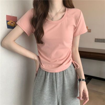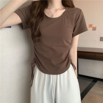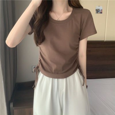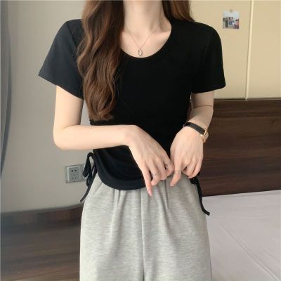 韓國外貿韓版新款原版抽繩短袖t恤女夏季韓版修身休閒短款上衣