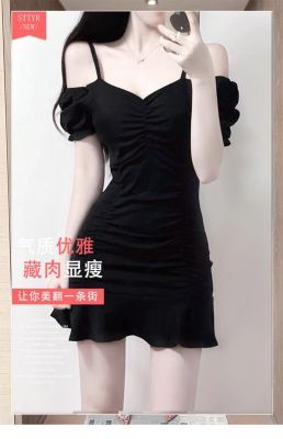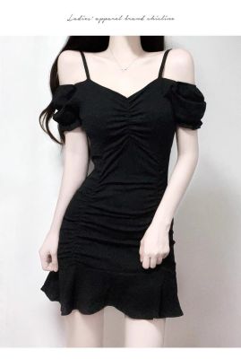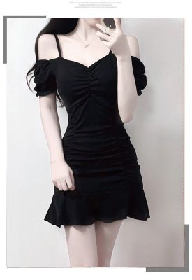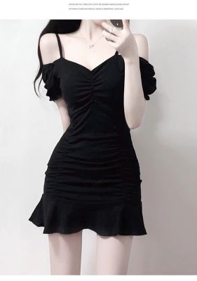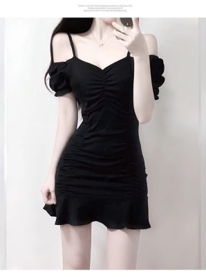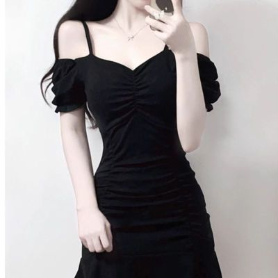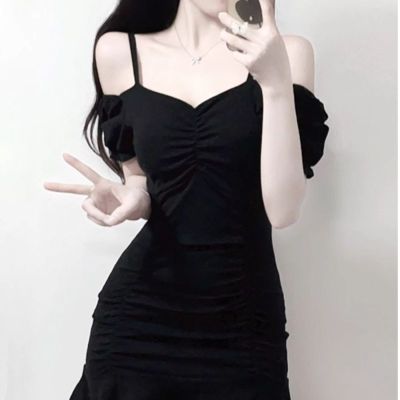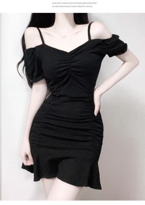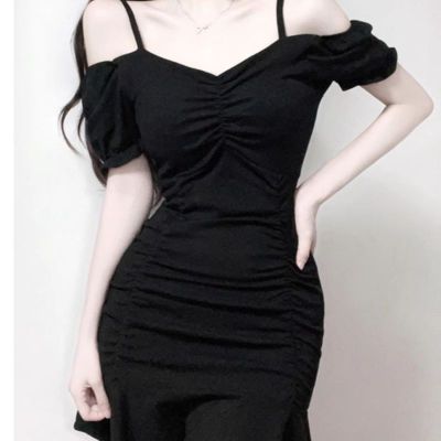 黑色緊身甜辣chic連衣裙性感顯瘦夜場包臀小黑裙夏一字肩A字短裙