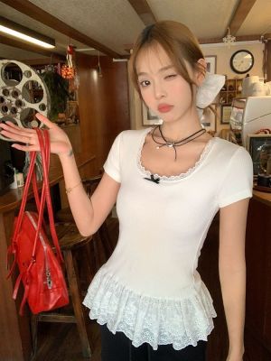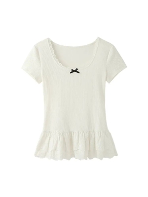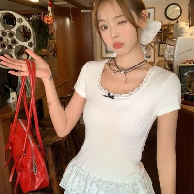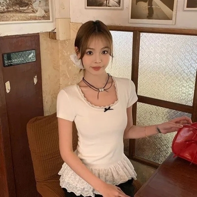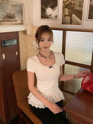 宋正恩白色蝴蝶結短袖t恤女夏季蕾絲花邊設計感正肩修身體恤上衣