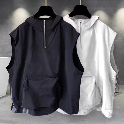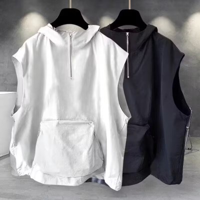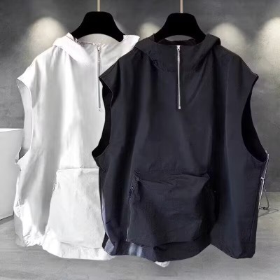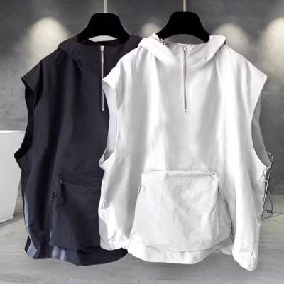 連帽短袖t恤男女夏季潮流帥氣純色拉鏈拼接無袖上衣ins休閒寬鬆