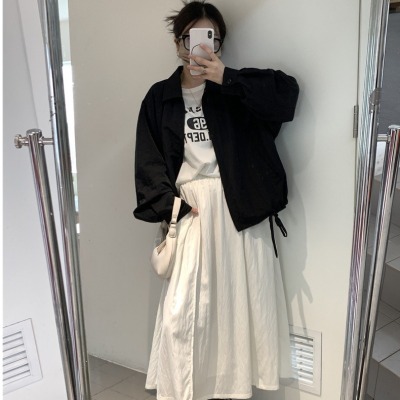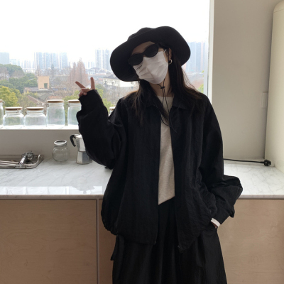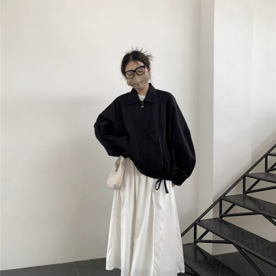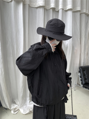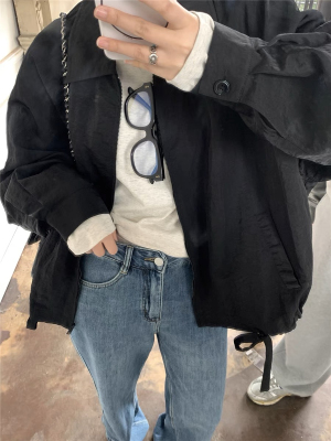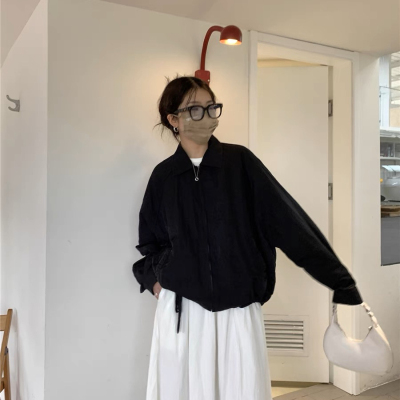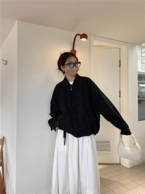 New cool black sweet sausage lapel strap zipper short windbreaker jacket lantern sleeve spring and autumn women's jacket