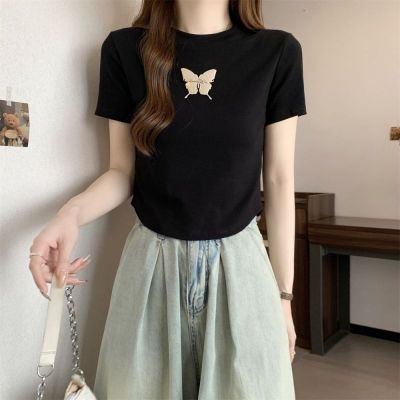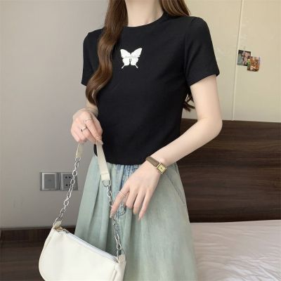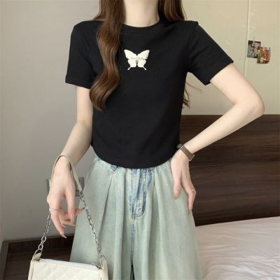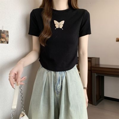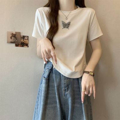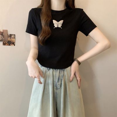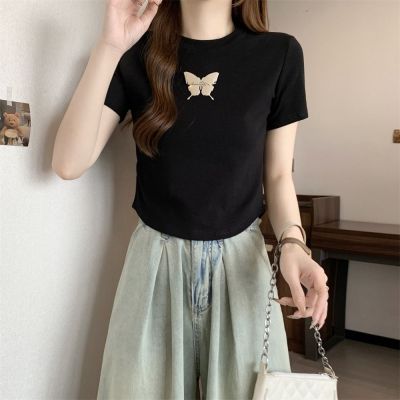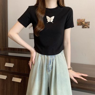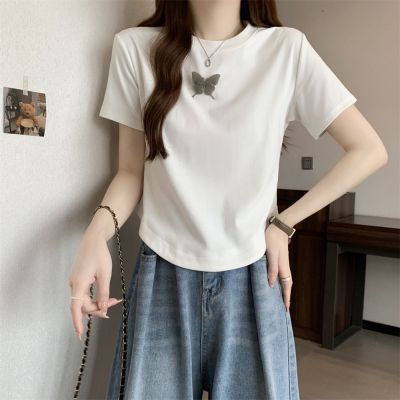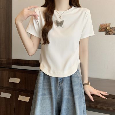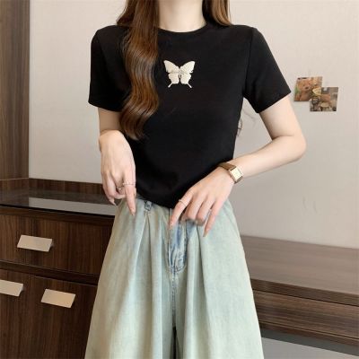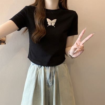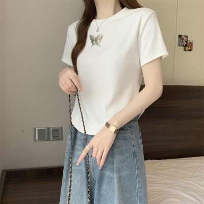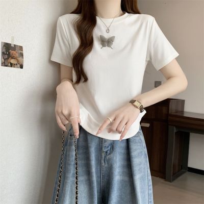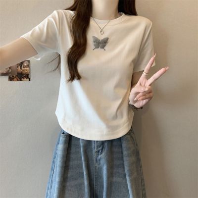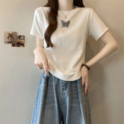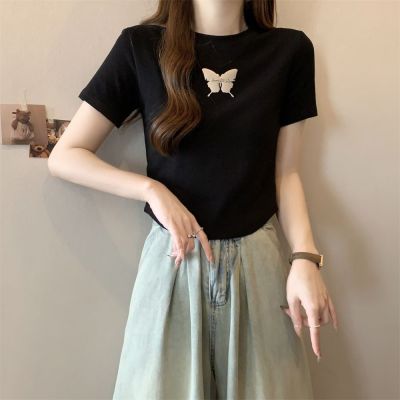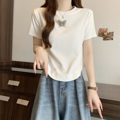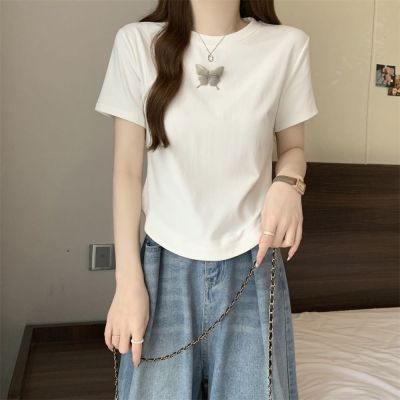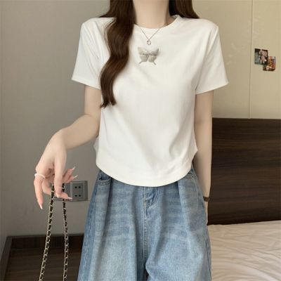 Real photo 40 pure cotton 210g 92 cotton/8 spandex short-sleeved T-shirt women's pin bow
