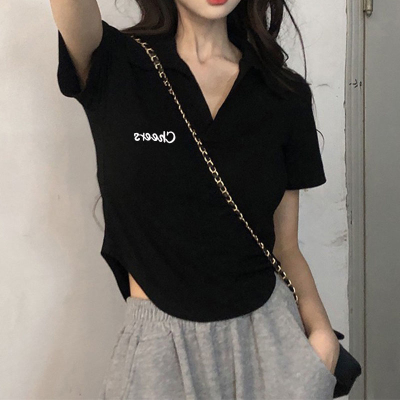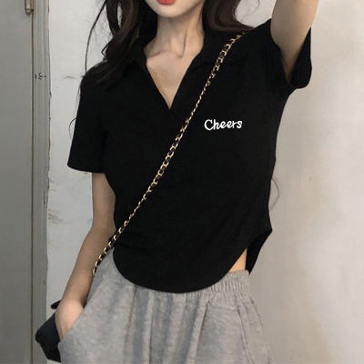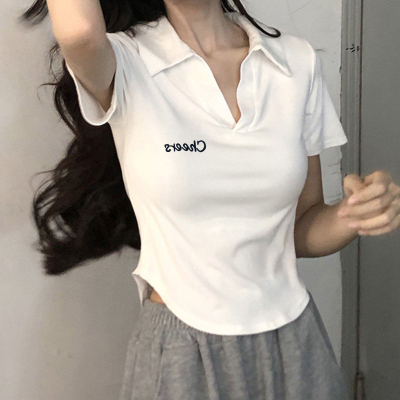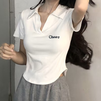 95 cotton 5 spandex quality white irregular polo collar short sleeve shoulder T-shirt for women for summer