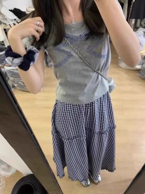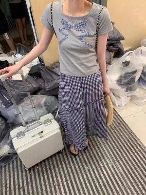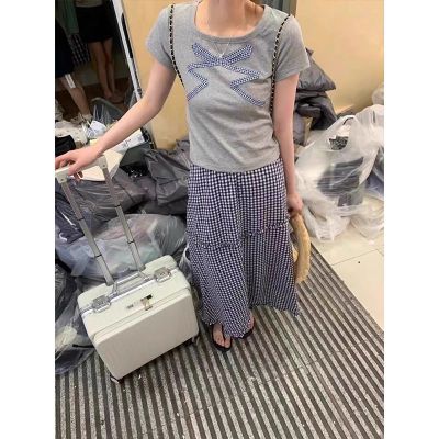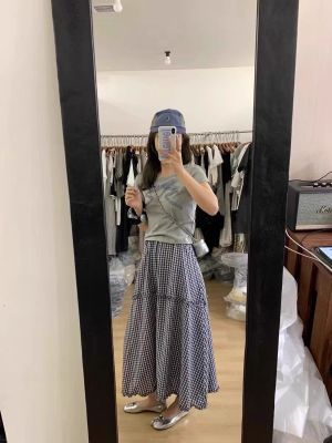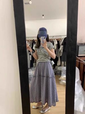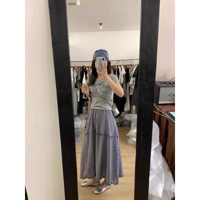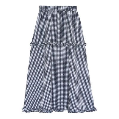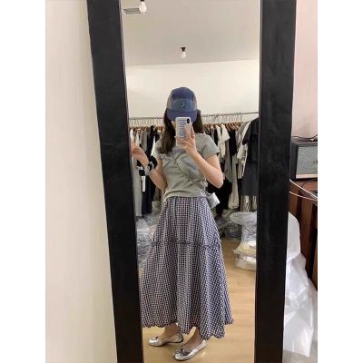 Korean wavy plaid skirt summer elastic waist slim and versatile plaid mid-length sweet skirt for women