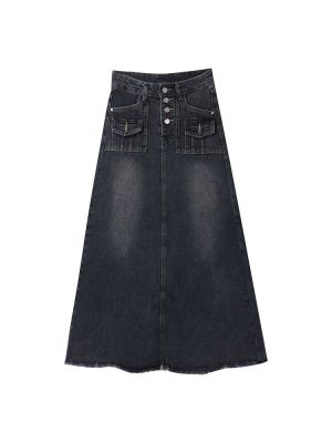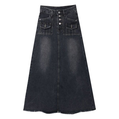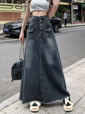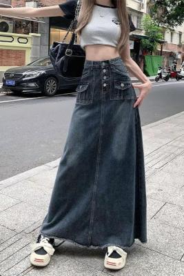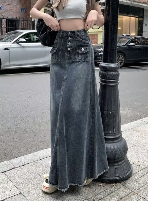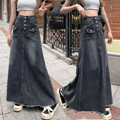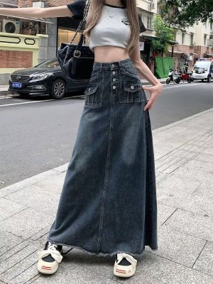 2025 Spring High-Waisted Frayed Denim A-Line Midi Skirt for Women - Korean Version, Ins Trendy Retro Design, Unique and Chic