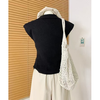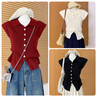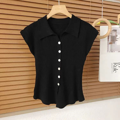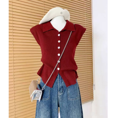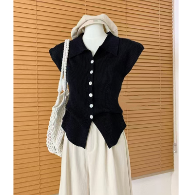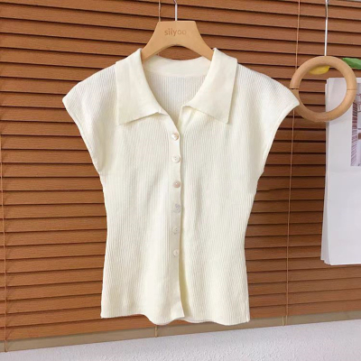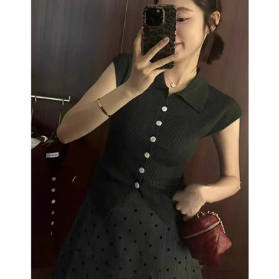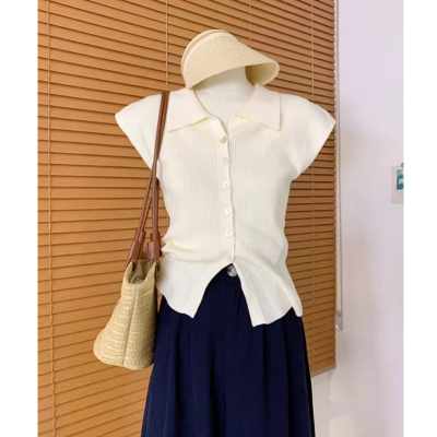 Knitted sweater Hong Kong style retro POLO collar single-breasted small flying sleeve knitted cardigan for women