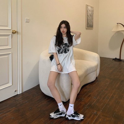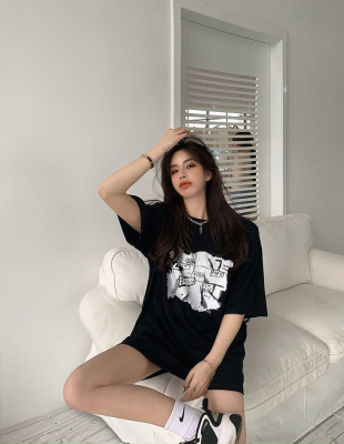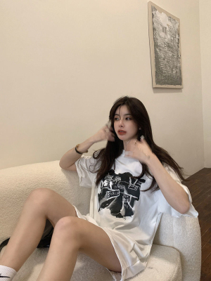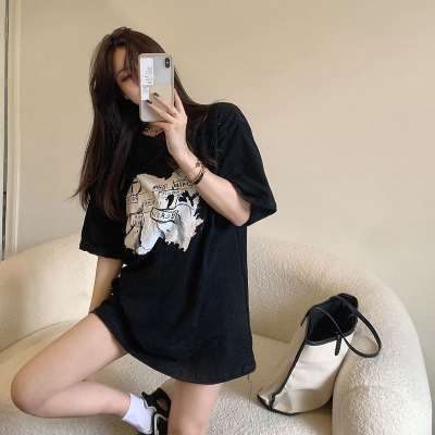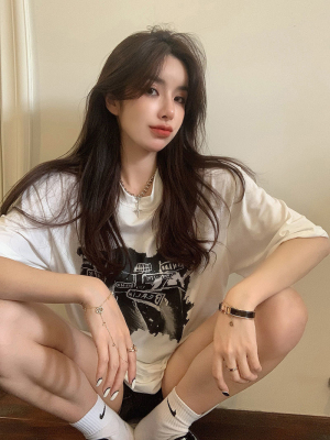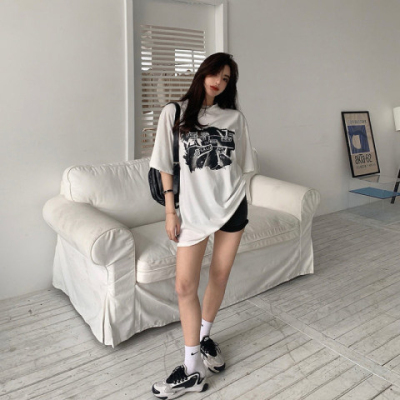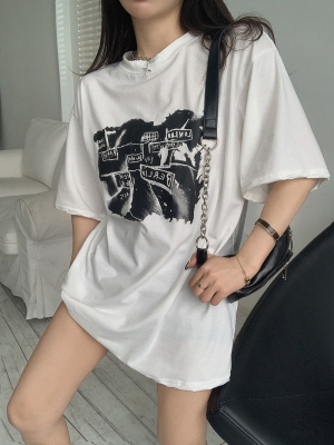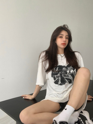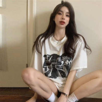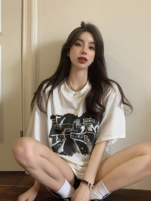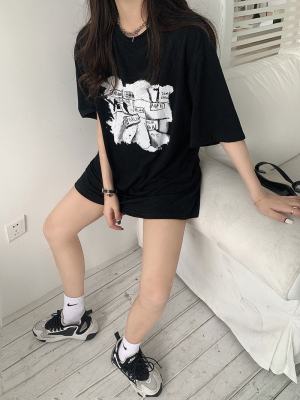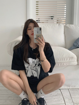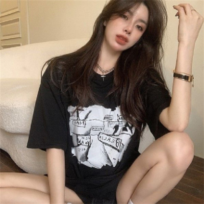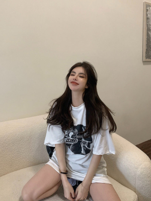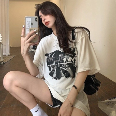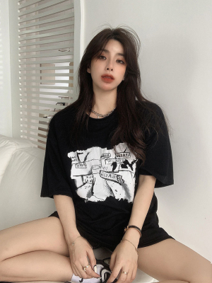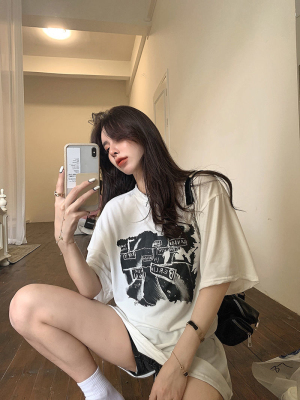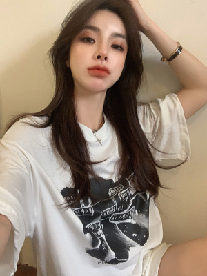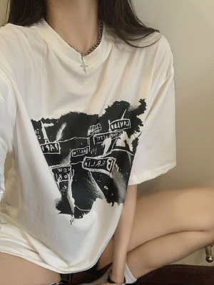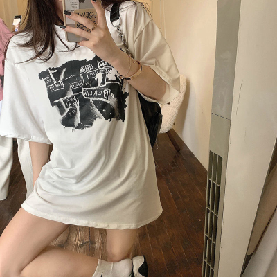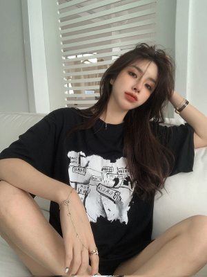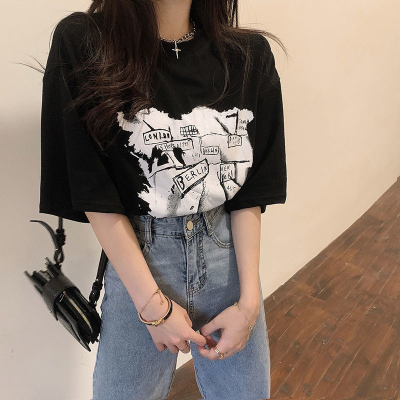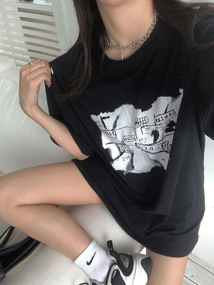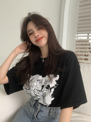 韓國外貿夏季新款港風簡約印花休閒寬鬆百搭上衣內搭圓領T恤女