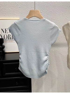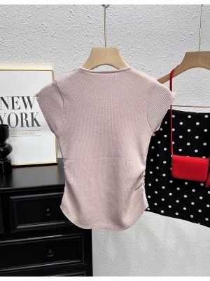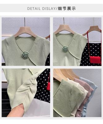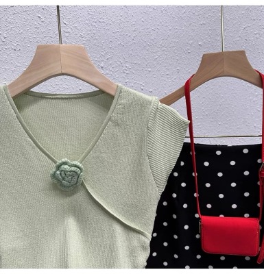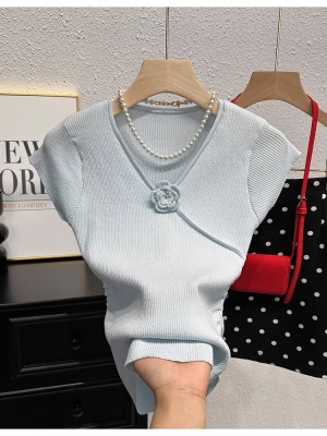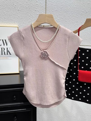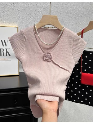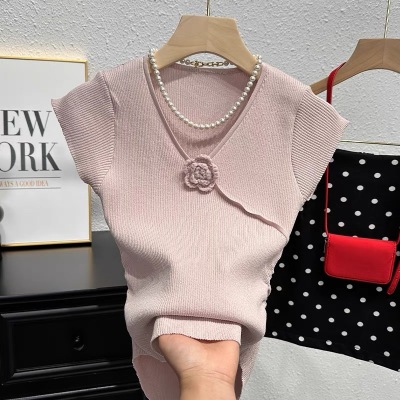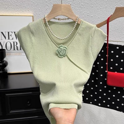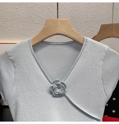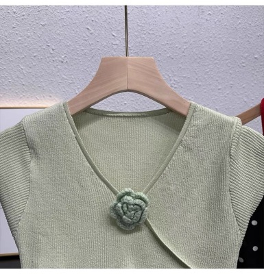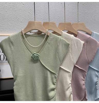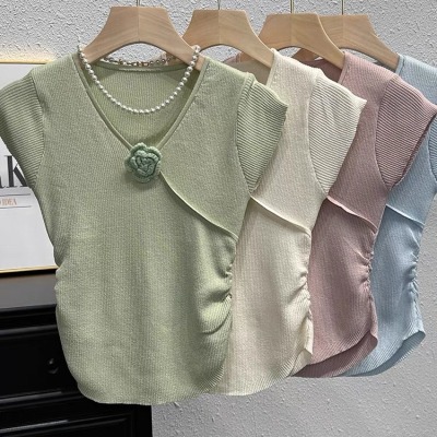 甜辣無袖針織衫女夏季設計感立體花朵百搭體恤別致褶皺掐腰短上衣