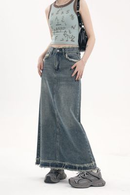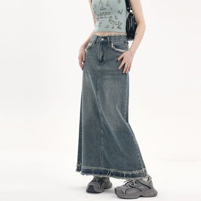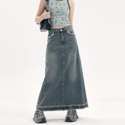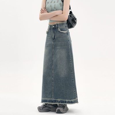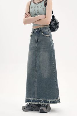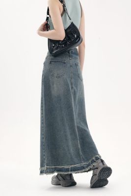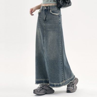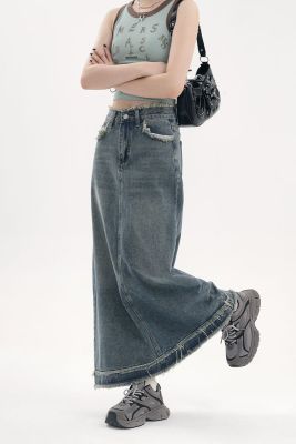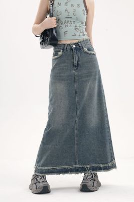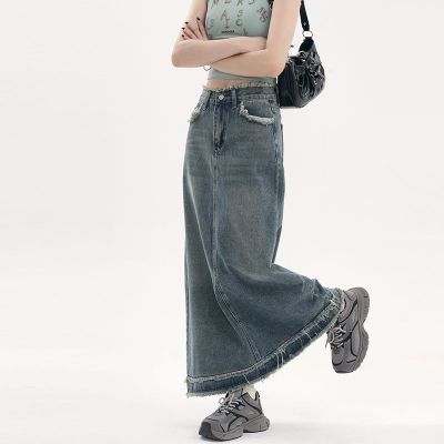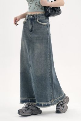 American fur-edged denim skirt for women's spring and autumn new high-waisted slim design niche A-line denim skirt