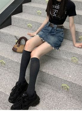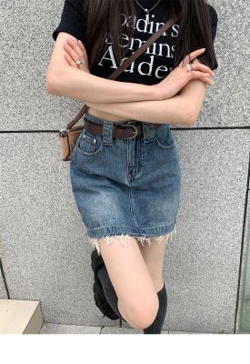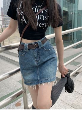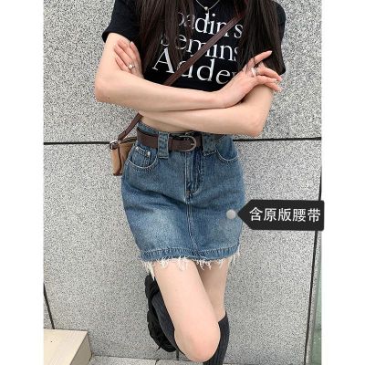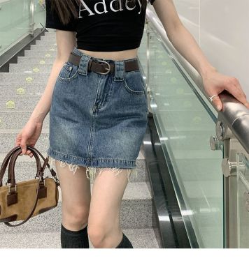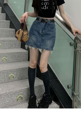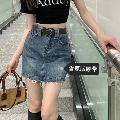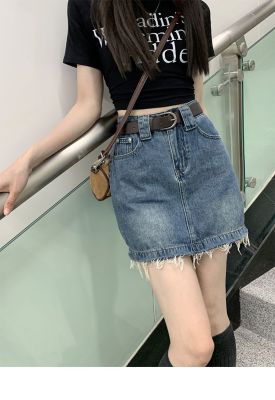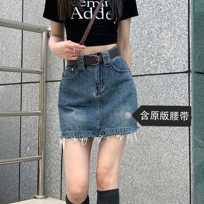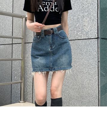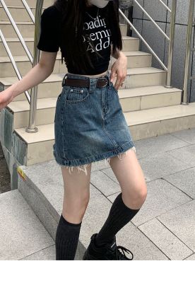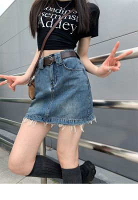 Hot girls' personality high-waist denim skirt for women in spring and summer new hot girls' fur edge design a-line hip-pack skirt