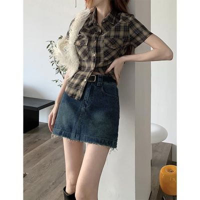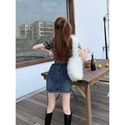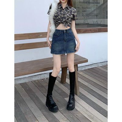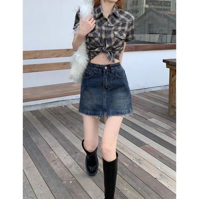 Korean style retro A-line denim skirt spring and summer new fur-edged short skirt Korean style ins denim hip half-body denim skirt