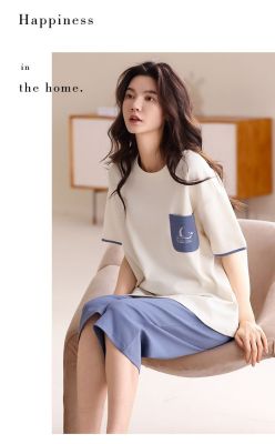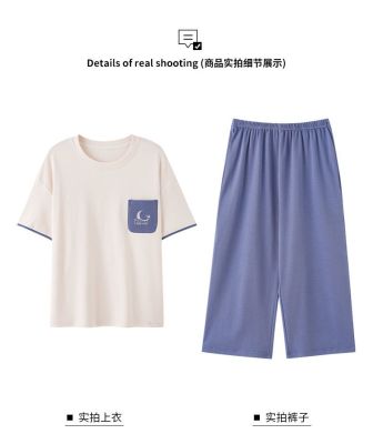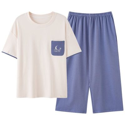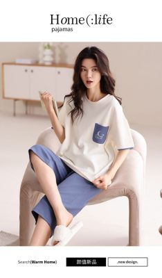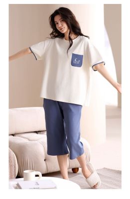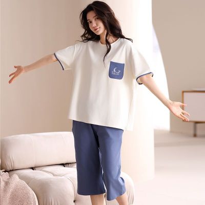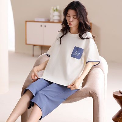 Summer pure cotton with chest pad round neck short sleeve cropped pants pajamas women's suit home clothes
