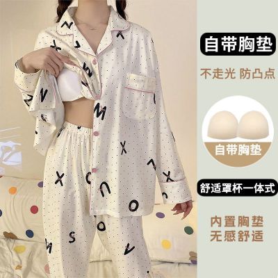 Spring imitation cotton with chest pad lapel cardigan long-sleeved pajamas women's suit home clothes