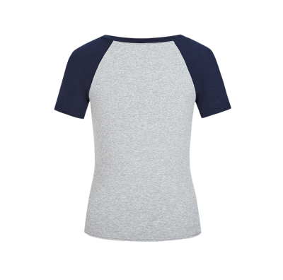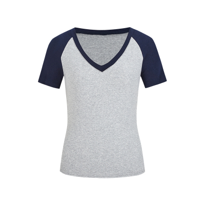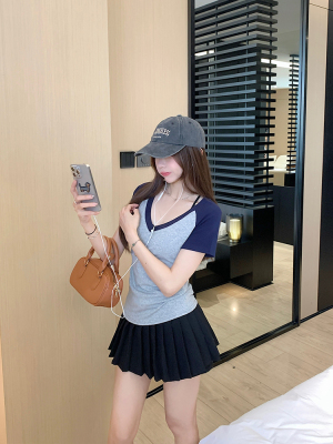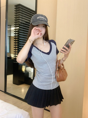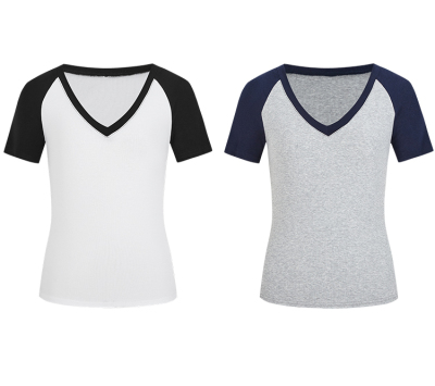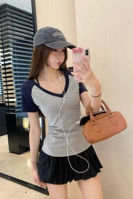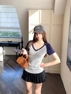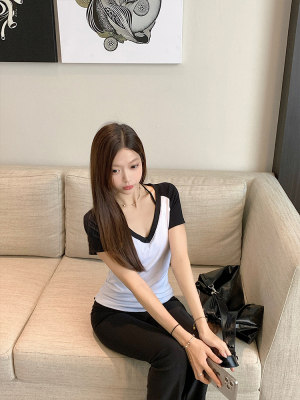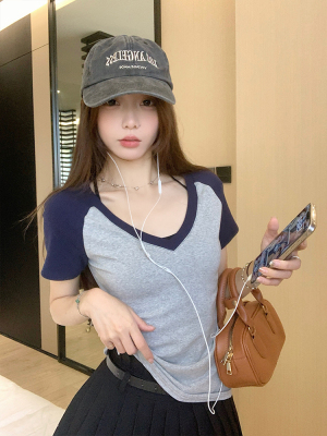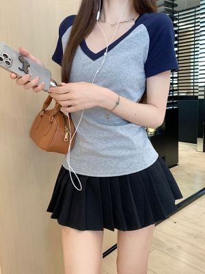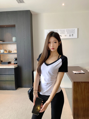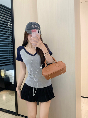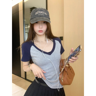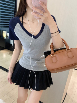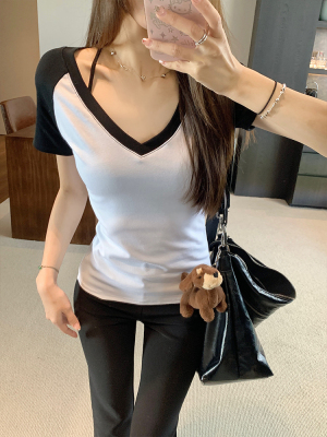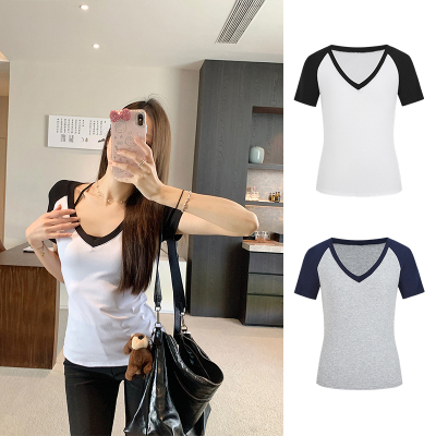 Real shot-2025 spring and summer color-blocking rag-shoulder short-sleeved T-shirt American retro V-neck slim fit inner versatile top