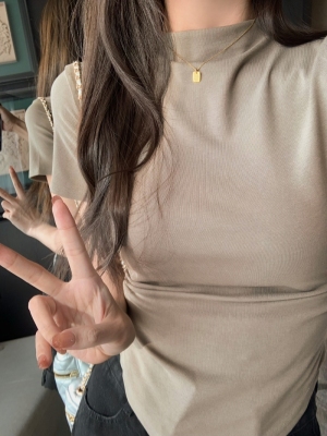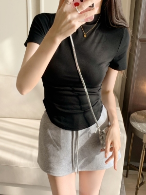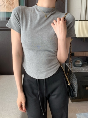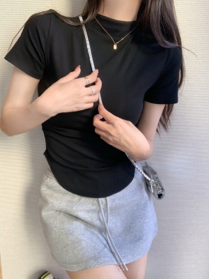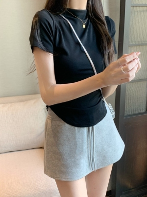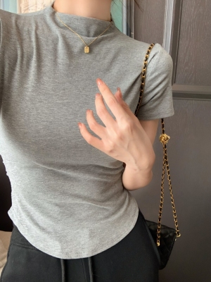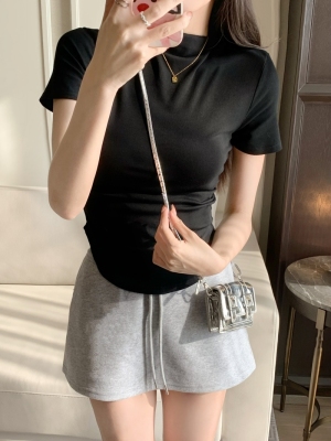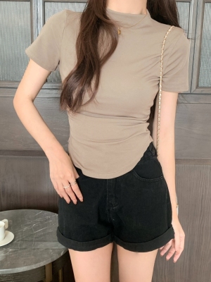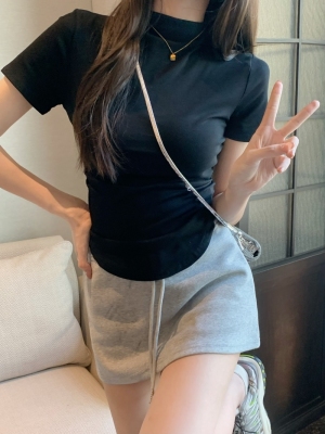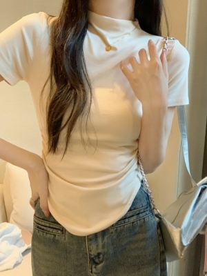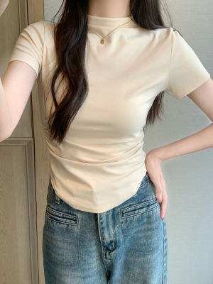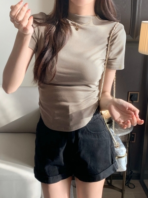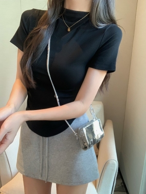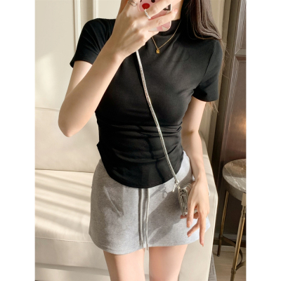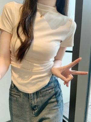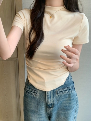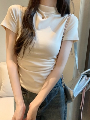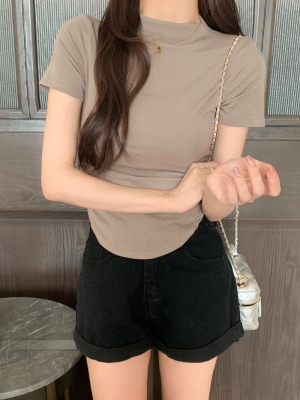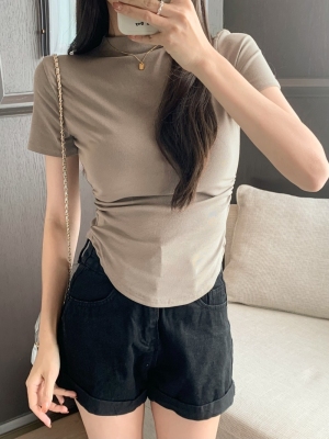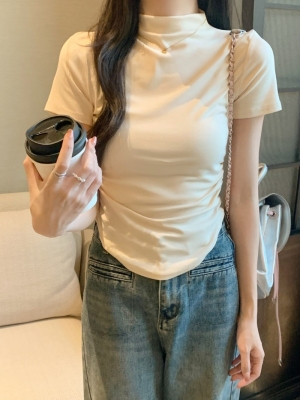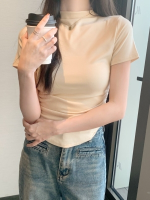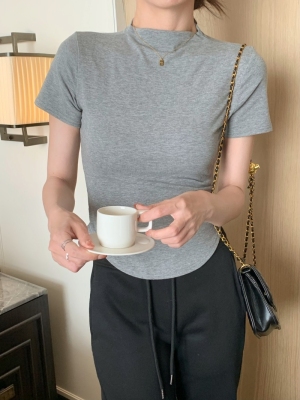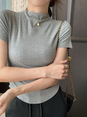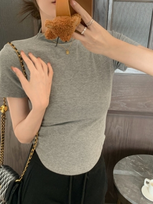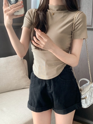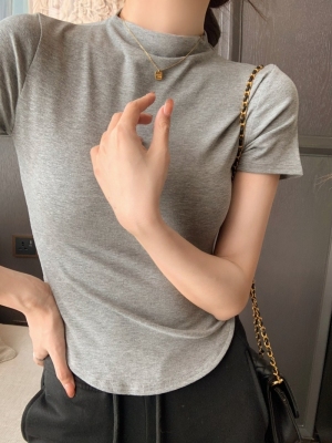 Real photo 40 pure cotton 210g 92 cotton/8 spandex short-sleeved T-shirt for women with waist-hugging half-high collar