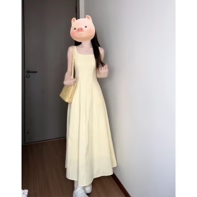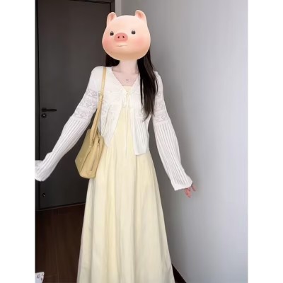 2025 spring new style for women French style thin and versatile long-sleeved cardigan square collar waist-closed slim suspender dress